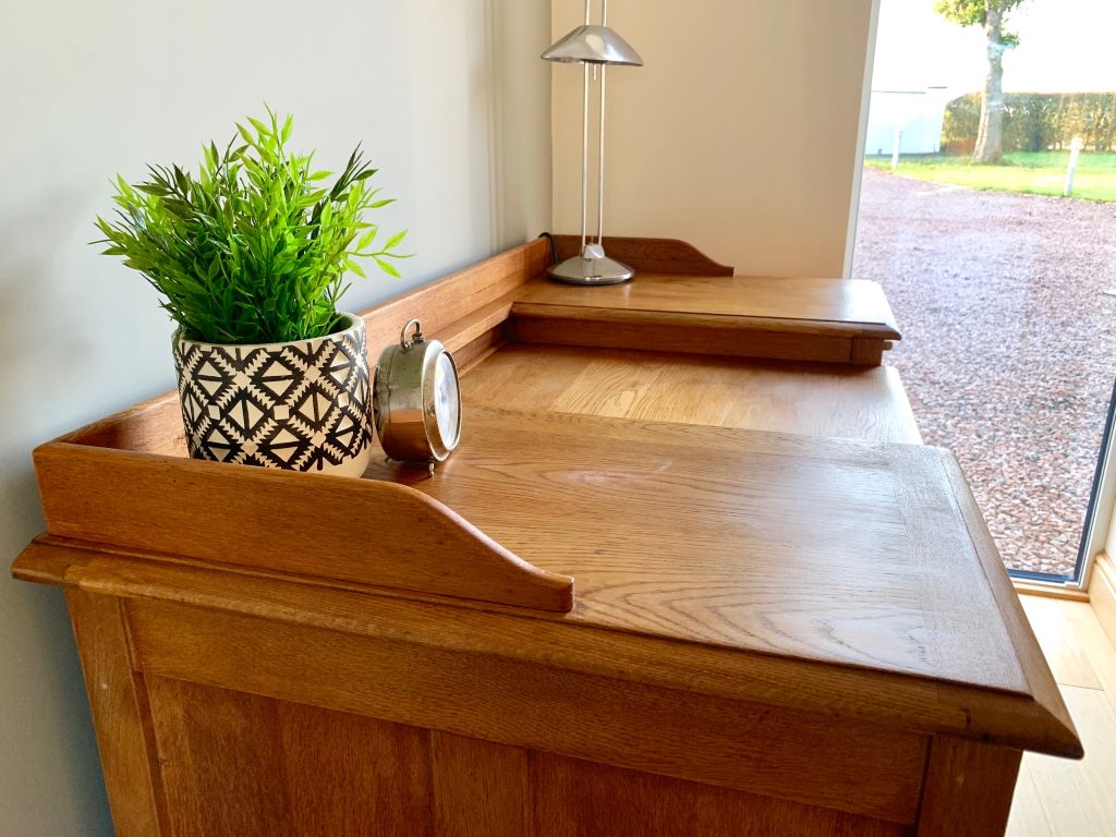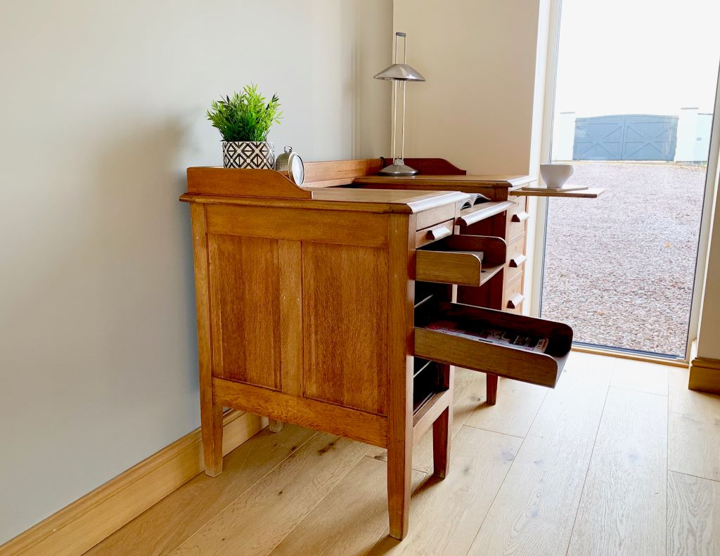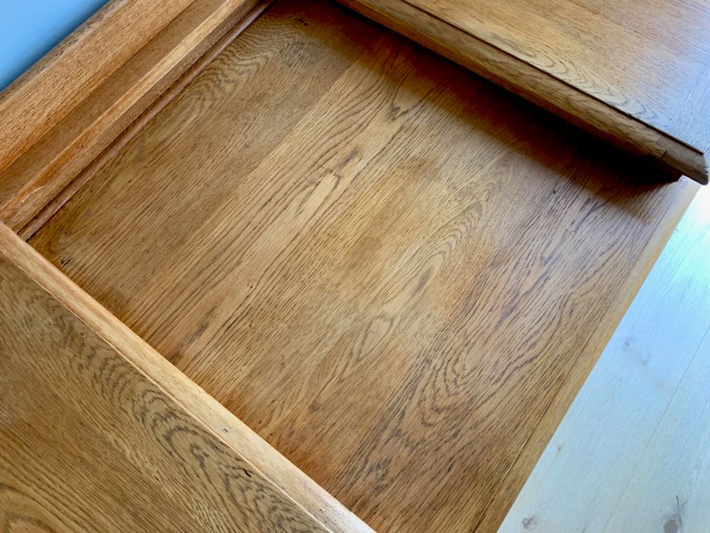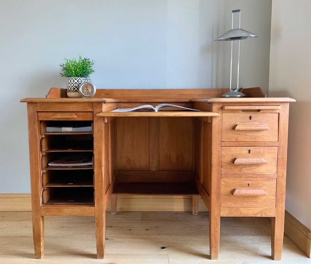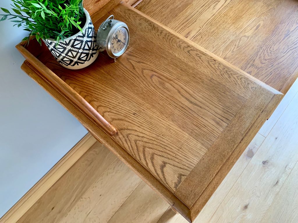 We love the overall shape, colour and condition. Unusual design, top quality radial cut oak and without doubt a fantastic colour. The colour and condition are exactly as you would want an original vintage desk of this age. The size of the desk also makes it very usable without being over powering, or an issue trying to fit through doors and in to your space.