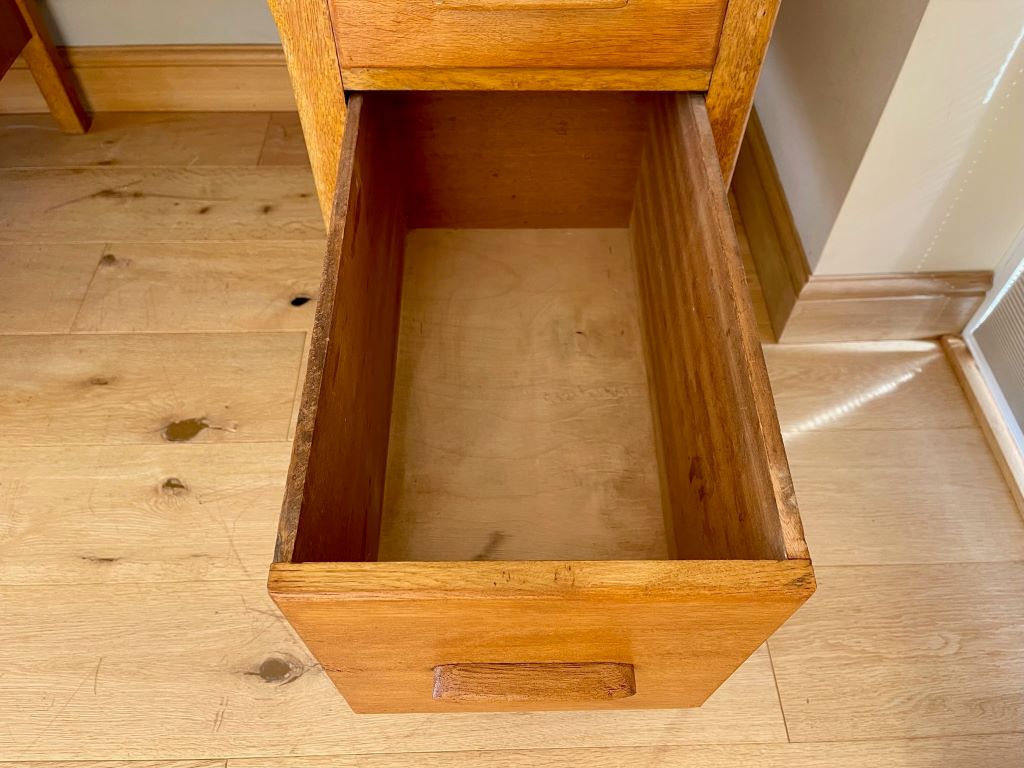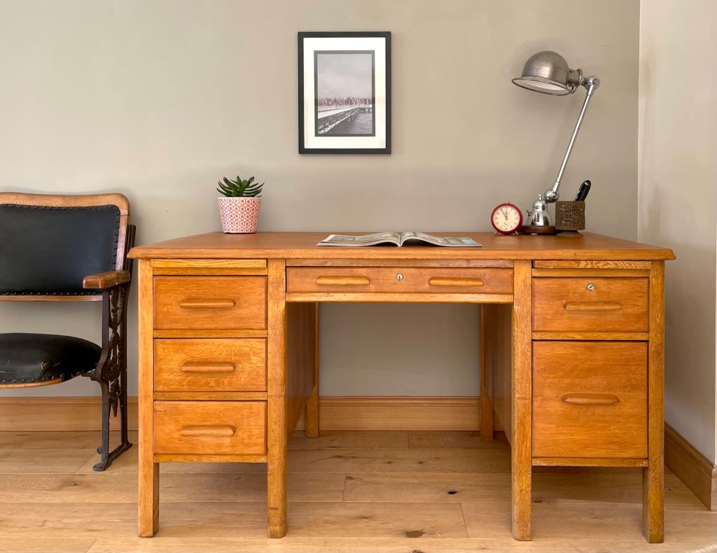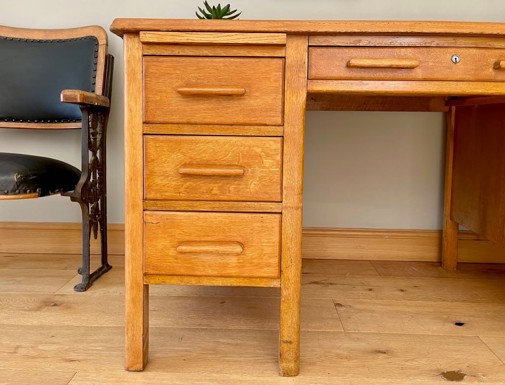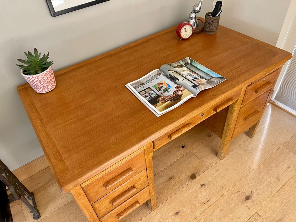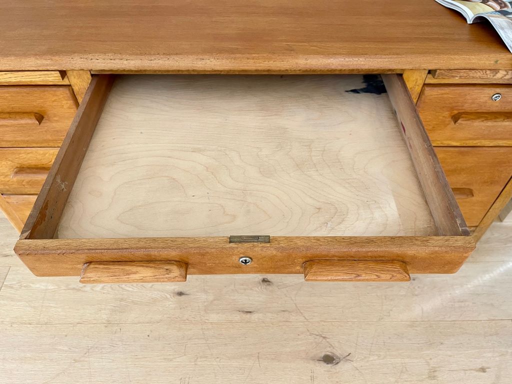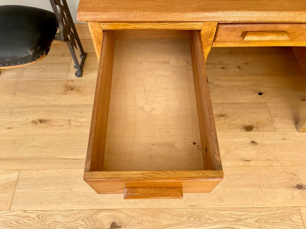 An exceptional mid century oak desk handmade by Astrola of London (Hammersmith, W6). It dates from around the late 1940’s to late 1950’s and is in completely original condition but fully cleaned and gently restored by us. This desk is originally from a school in South Cambridgeshire, close to Histon. It presents itself in a beautifully aged oak colour and patina with a really nicely sized work surface for home use. All six drawers un freely and have been cleaned and sanded back internally. The desk also retains the original makers badge on the rear.