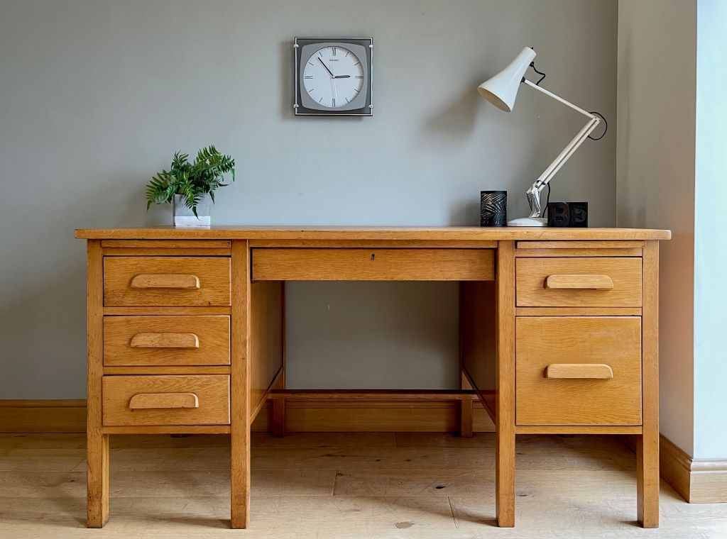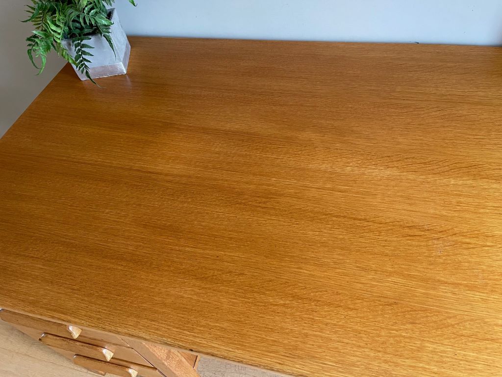 A beautiful 1960’s desk handmade on solid oak. It dates from around the mid 1950’s to early 1960’s and is in completely original condition but fully cleaned and gently restored by us. Presented in perfectly aged and coloured golden oak it is a very solid desk and heavyweight to reflect the quality of wood used. The work surface is very clean and very generous in size – perfect for a regular use desk. The desk has one deep filing drawer to the bottom right pedestal. There is plenty of additional storage in the further five drawers, together with two pull out top pedestal shelves.