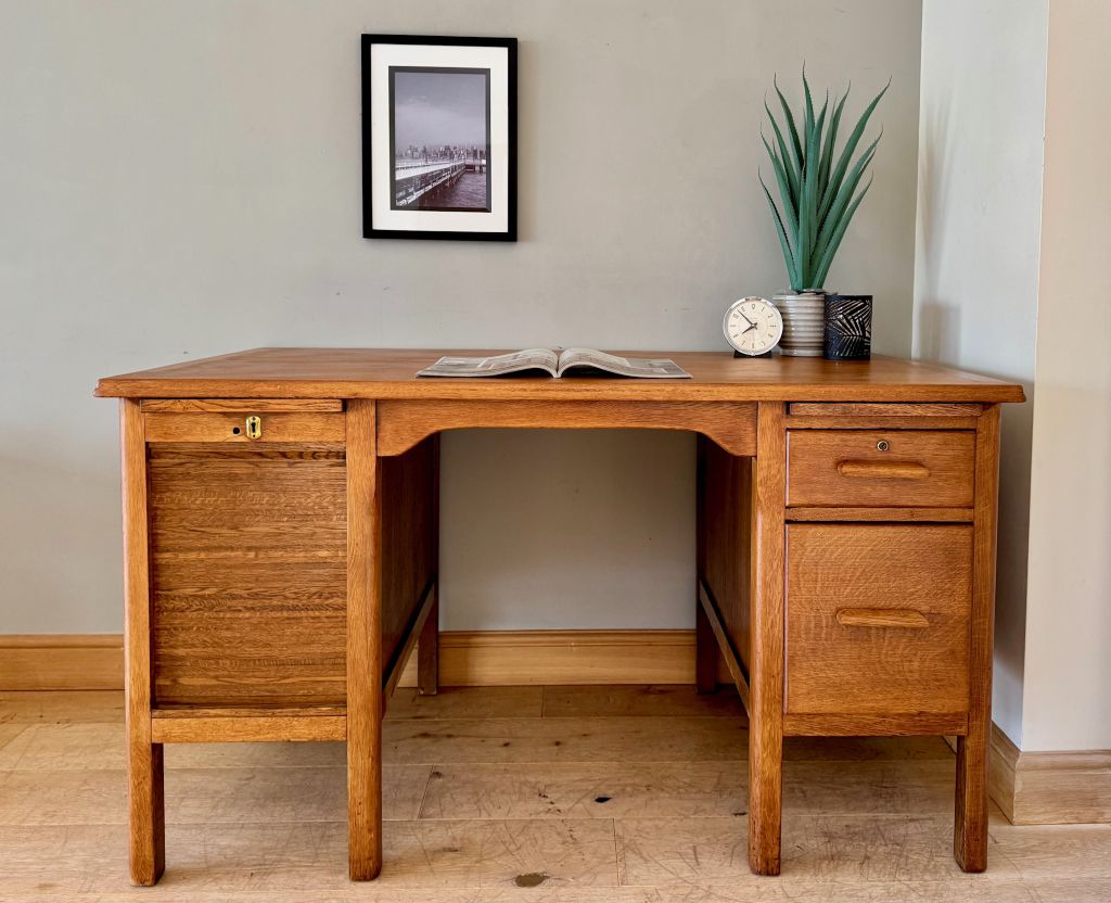A stunning mid Century oak desk produced by Astrola of Hammersmith, London. Completely original condition but fully cleaned and refurbished by us. Presented in beautifully coloured oak with through dovetails joints to the pull out drawers and dovetails on the two main pedestal drawers.  The tambour door  works smoothly, as do all drawers and the pull out top shelves.