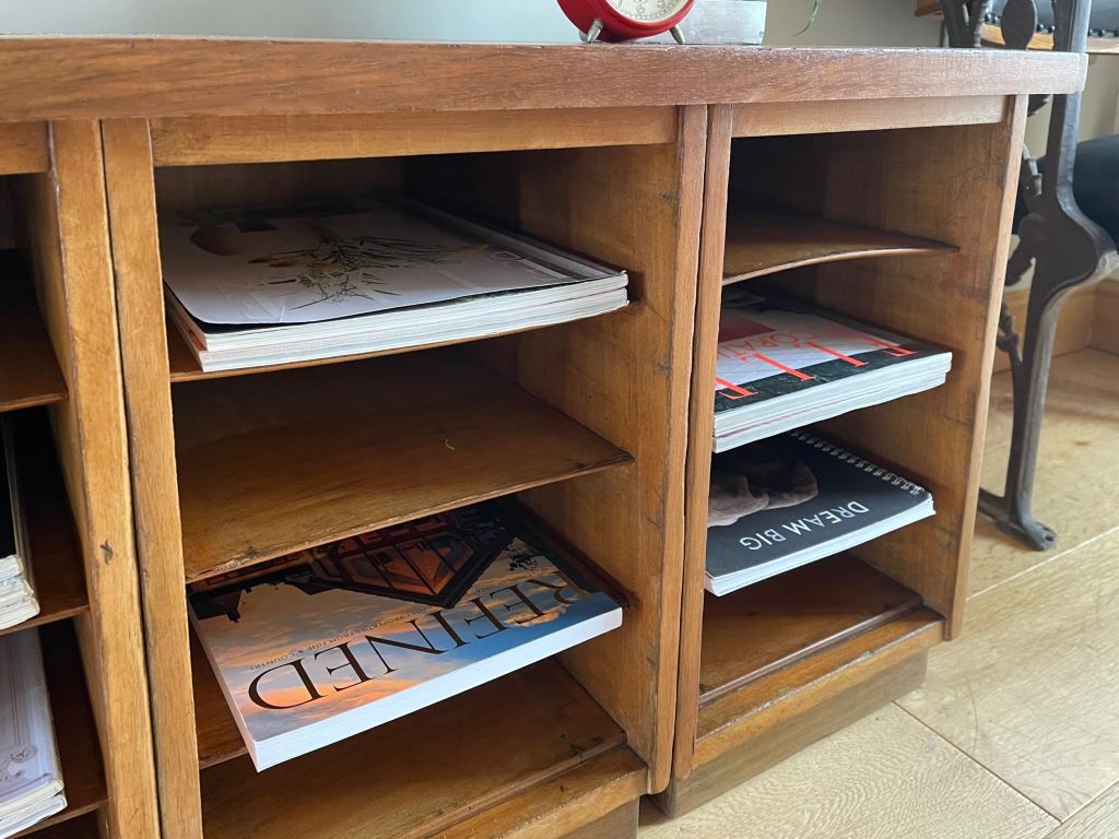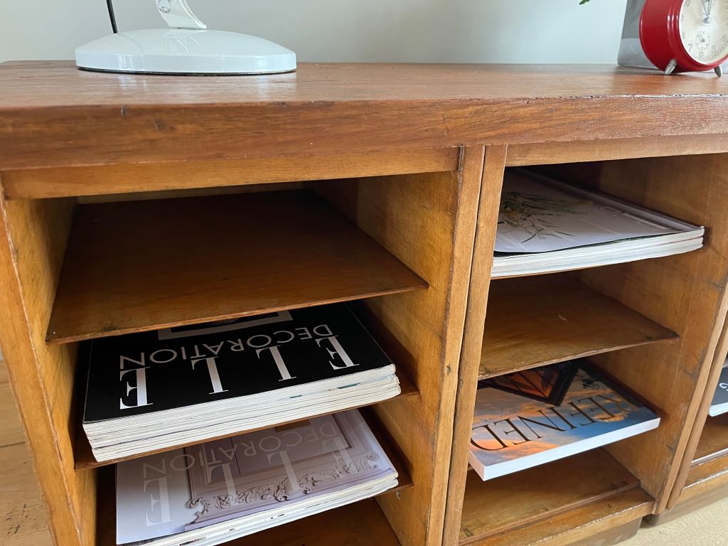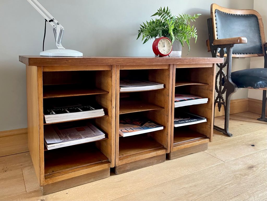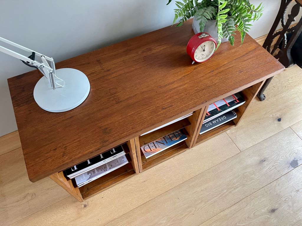 An usual and very cool filing cupboard from an old school in Lincolnshire. It dates to around the late 1950’s to early 1960’s and is made form solid teak with an Iroko veneer top. We love the quirkiness, age, colour and size. Perfect for somebody that takes their magazine collection pretty seriously? It could also be a filing cupboard for paperwork. We think the cupboard would make a fantastic side table or bedside table; or a TV stand. Something vintage, stylish and different – exactly what we love.