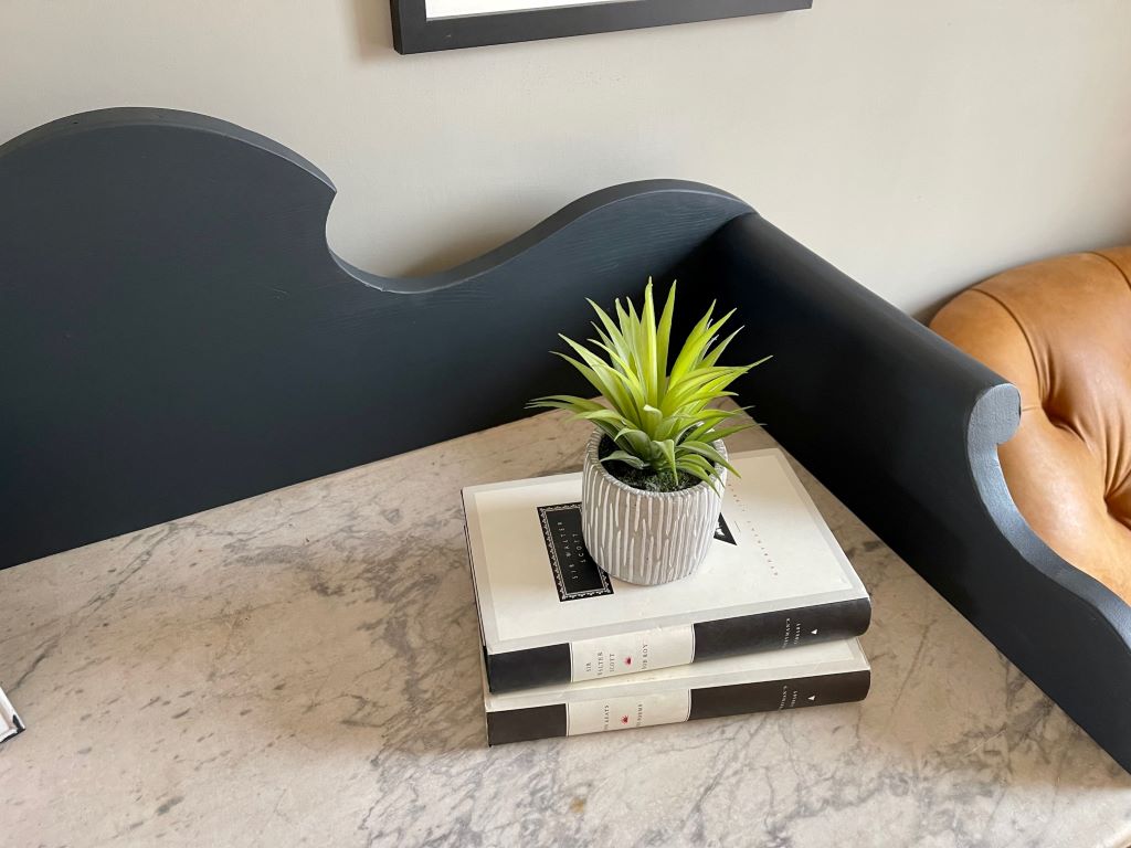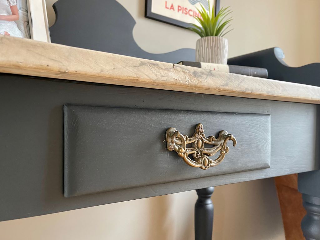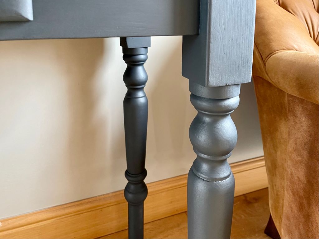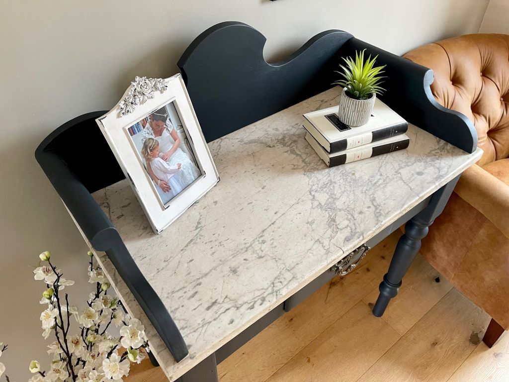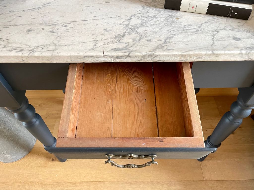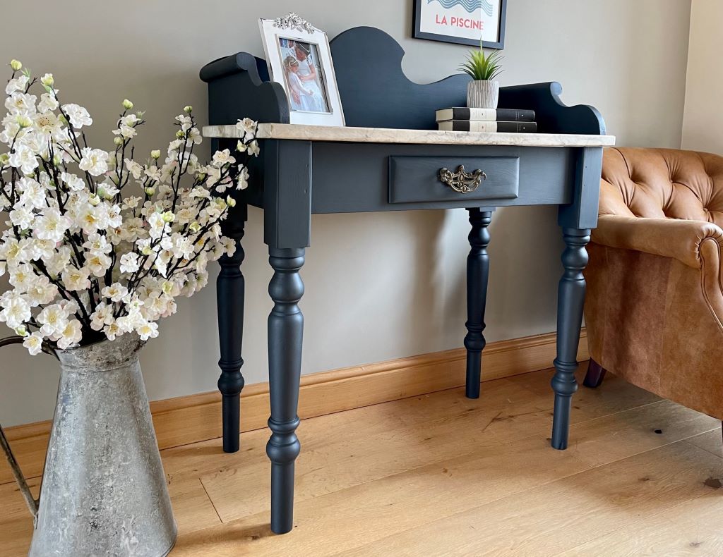This washstand dates to the early part of the 20h Century, circa 1900-1920.  It was made of solid pine frame with a heavy marble top. Originally the top would have been for the water bowl and jug for washing. Now these wash stand are used as hall tables, bedroom tables, bathroom towel bale holders etc etc. We fully stripped the whole frame and refinished it in Farrow & Ball Railings.  A clear coat of Annie Sloan chalk paint wax has also been applied, to seal against water and spills.