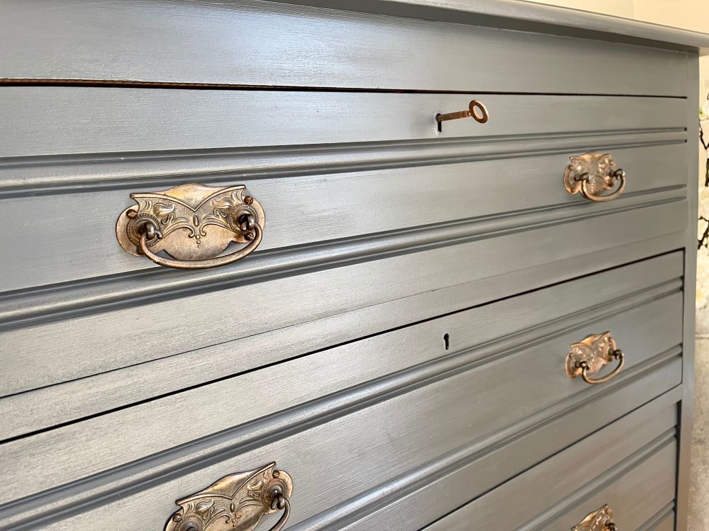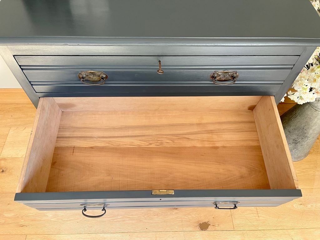 An original set of early 20th Century Art Nouveau drawers. The drawers date from around 1910-20 and are graduated in depth from the top to bottom. They are well constructed from solid wood and all drawers are exceptionally clean inside (please see photographs). The drawers all have working locks and one key that locks and opens all three drawers. The design is very much Art Nouveau inspired, as can be seen on the handle design and drawer fronts. We fully stripped the chest and refinished it in Farrow & Ball Railings with a clear wax coat for protection against knocks and spills etc.