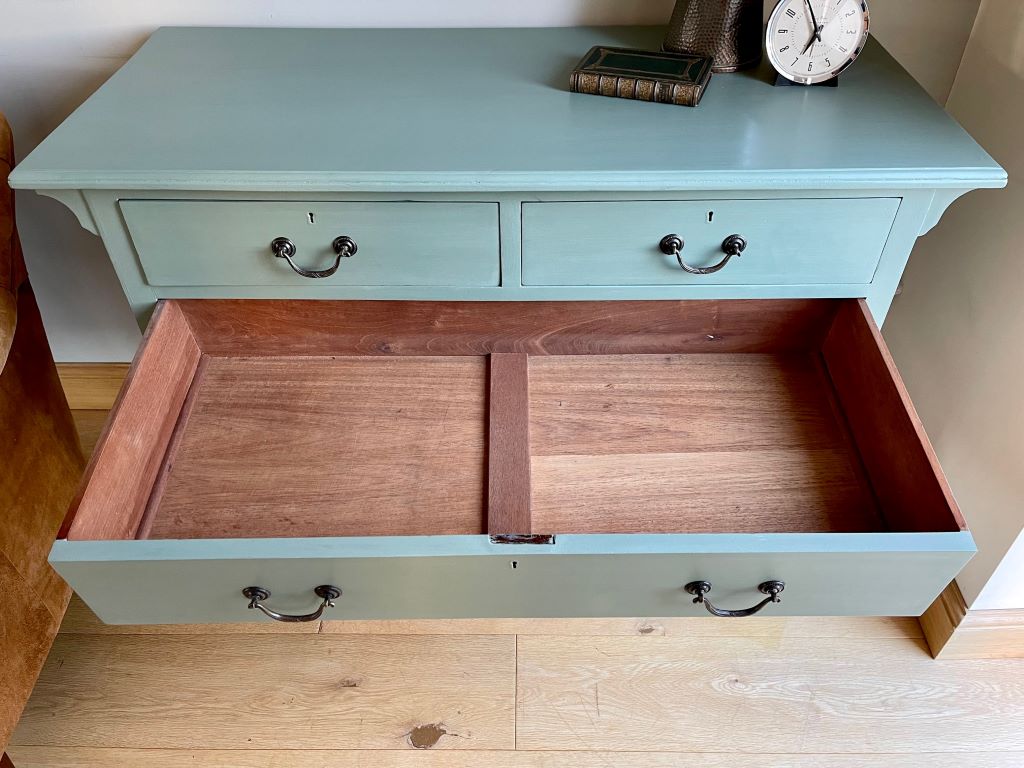 An original set of early 20th Century Edwardian drawers. The drawers date from around 1900-10 and have ne Regency period lines reproduced in the Edwardian era. They are constructed from solid wood and all drawers are very clean inside (please see photographs). All drawers retain their original reed and ribbon handles to prove its antique authenticity. The chest has been fully stripped and refinished in Farrow & Ball Green Smoke with a clear wax finish for protection against spills etc.