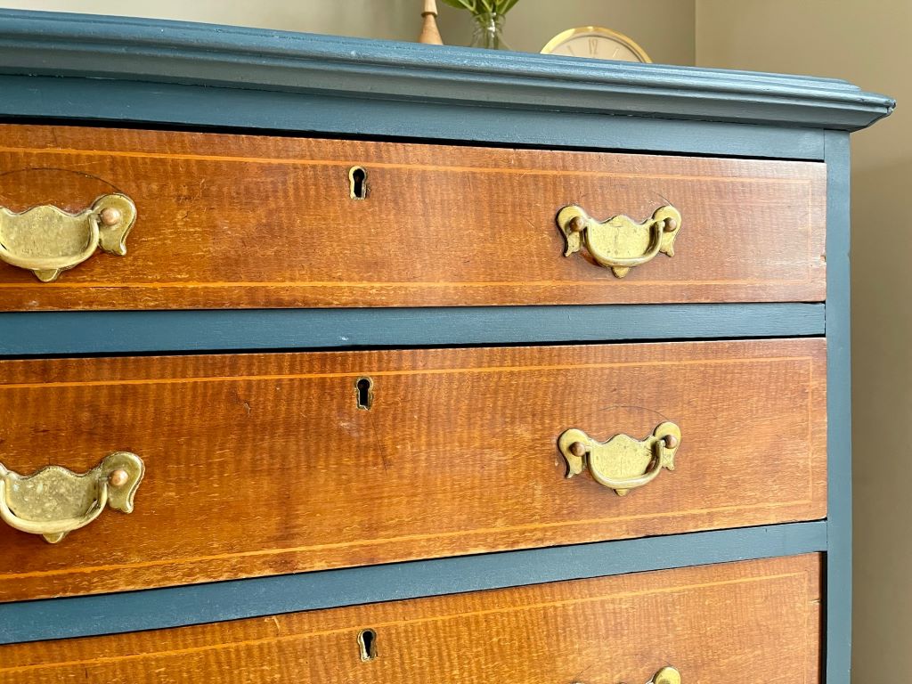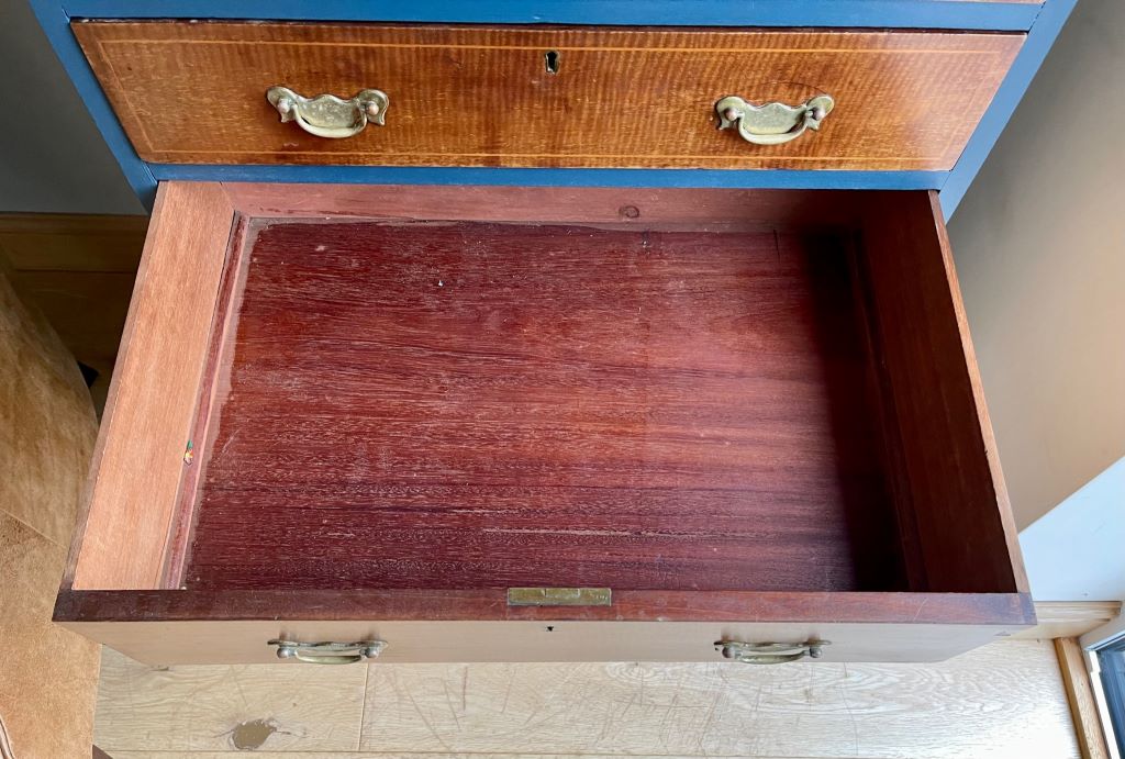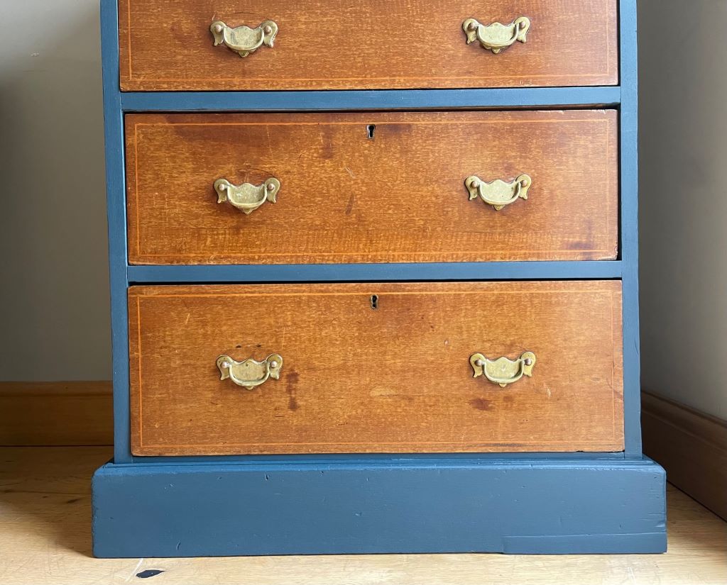 An original set of George III drawers. The drawers date from around 1800-1820 and are graduated in depth from the top to bottom. They are well crafted from mahogany with the drawer internals in their original quarter drawn oak. The design is very classically Georgian as can be seen on the original swan neck brass handle design. We fully stripped the chest and refinished it in Farrow & Ball Hague Blue with a clear wax coat for protection against knocks and spills etc.