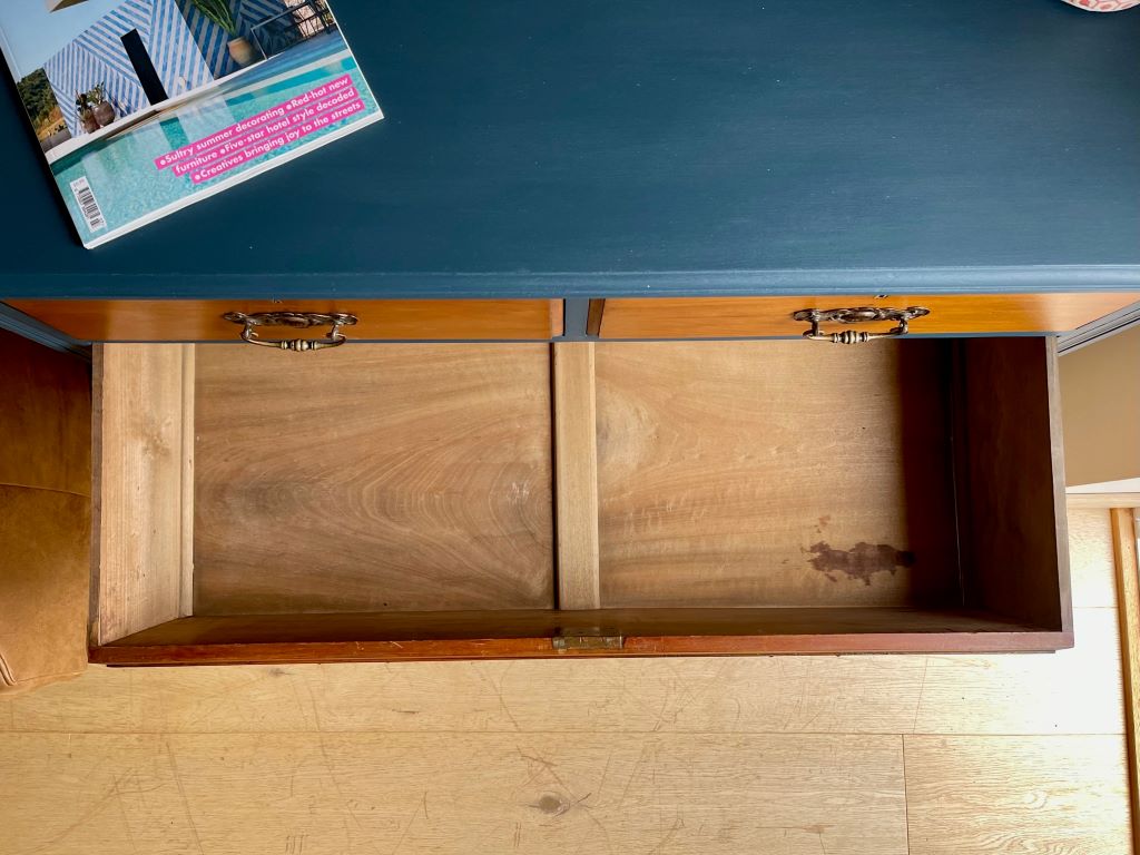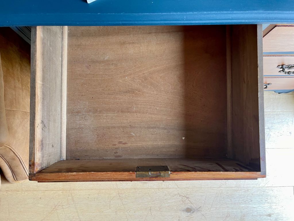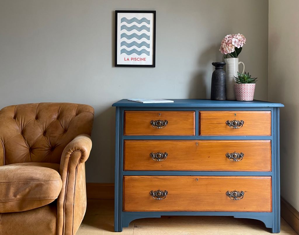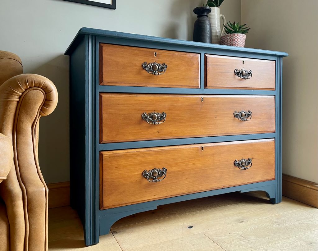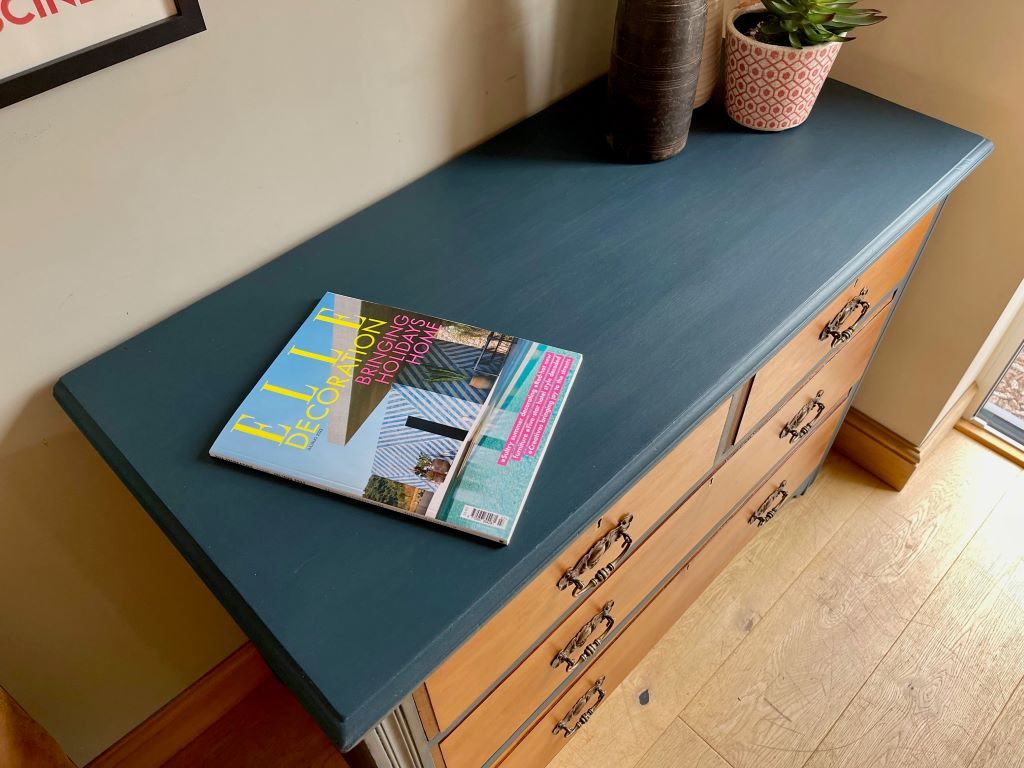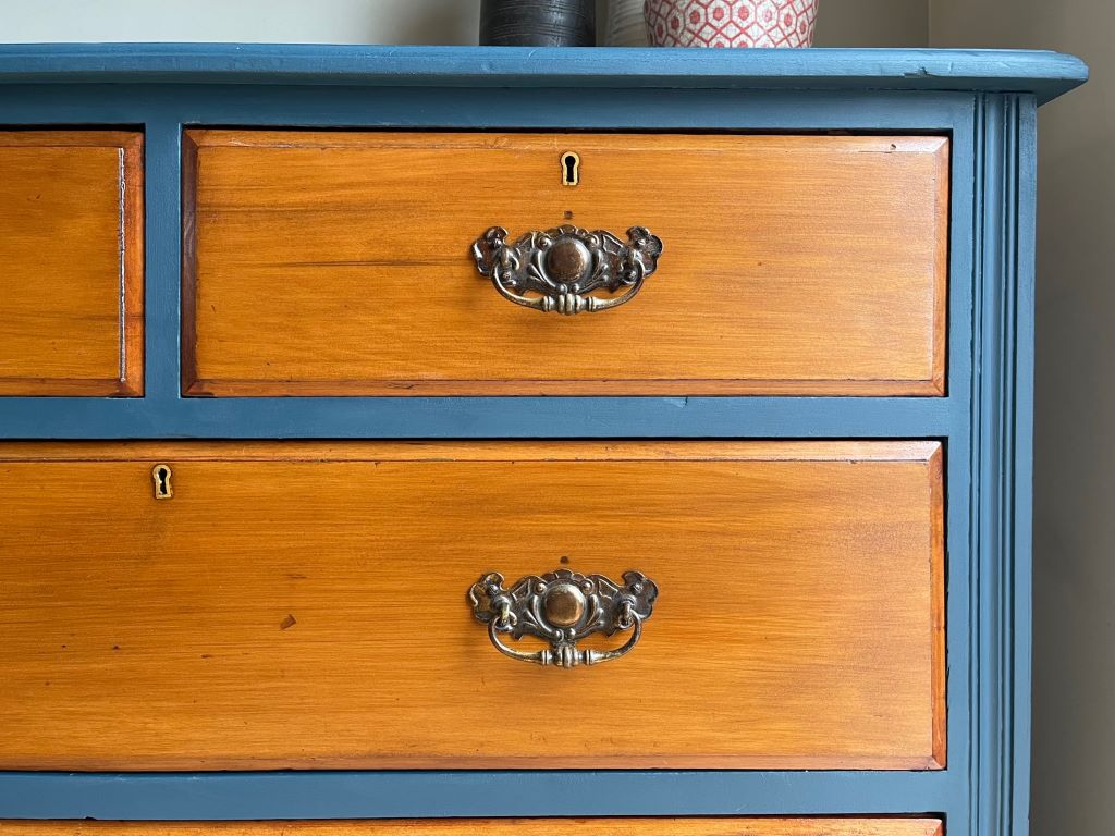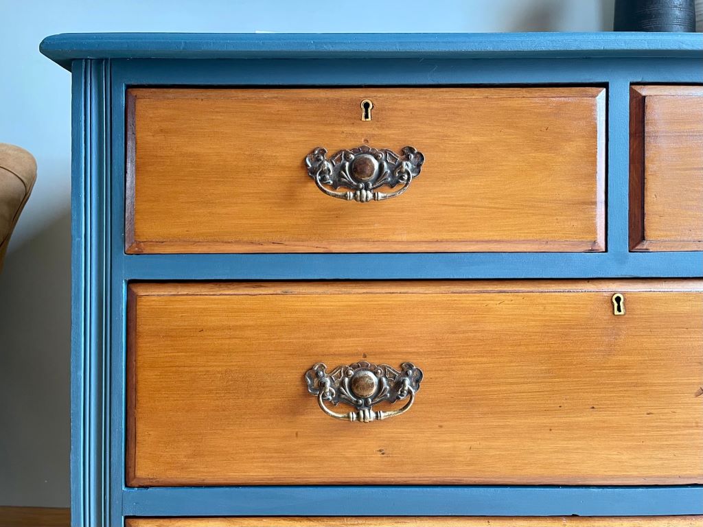 A circa 1910’s to 1920’s Edwardian chest of drawers. The chest has a good solid weight to it and original very pretty handles. We fully stripped and refinished the carcass in Farrow & Ball’s Hague Blue, with a clear wax coat for protection and resilience. The drawers were also refinished in a colour match stain and satin varnish. They are a super size for a bedroom, bathroom or hallway – or any other room you need them 🙂 A contemporary update to a classic piece with pretty handles and very clean drawers inside.