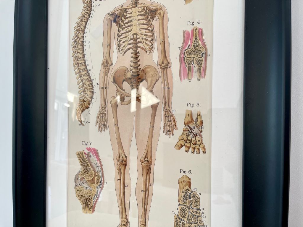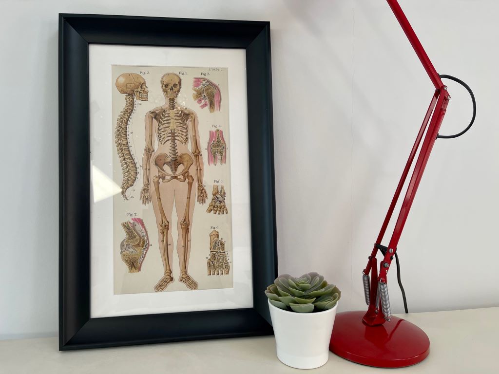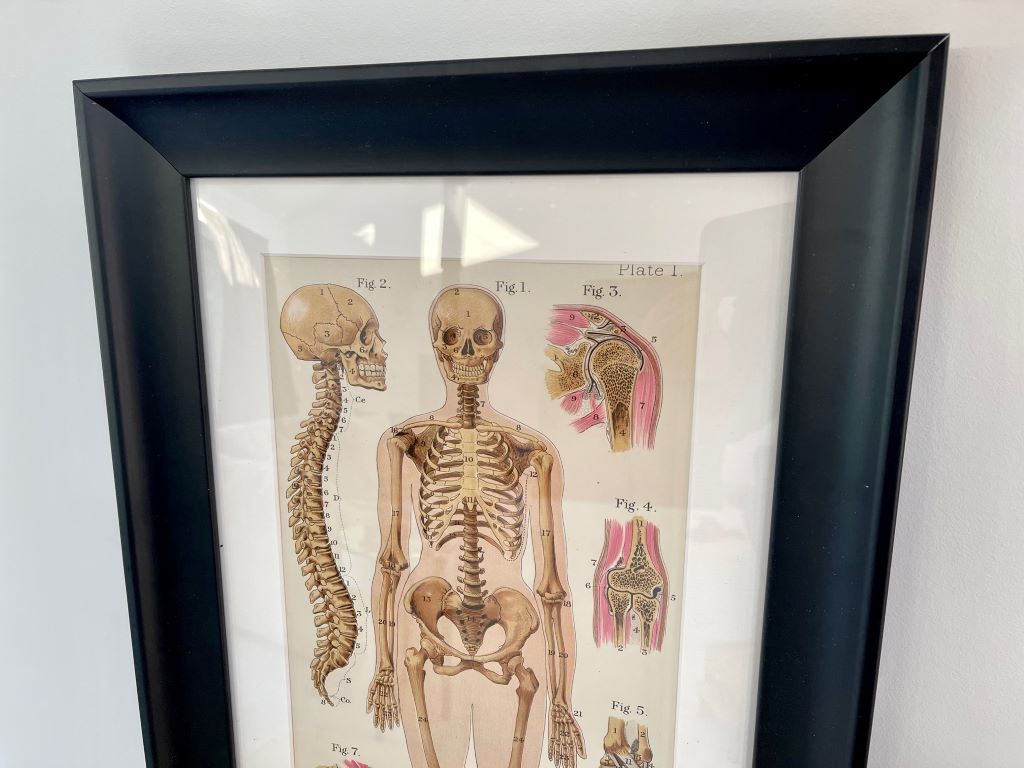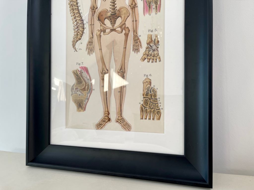 An original plate from the Third Edition (1924) of Baillieres Popular Atlas of The Anatomy and Physiology of the Human Body. This plate depicts the skeletal structure. We have bespoke mounted and framed the piece to protect it but show of its amazing colour and artwork. The mount is high quality card in Antique White within a 45mm Black moulded frame and acrylic front sheet.