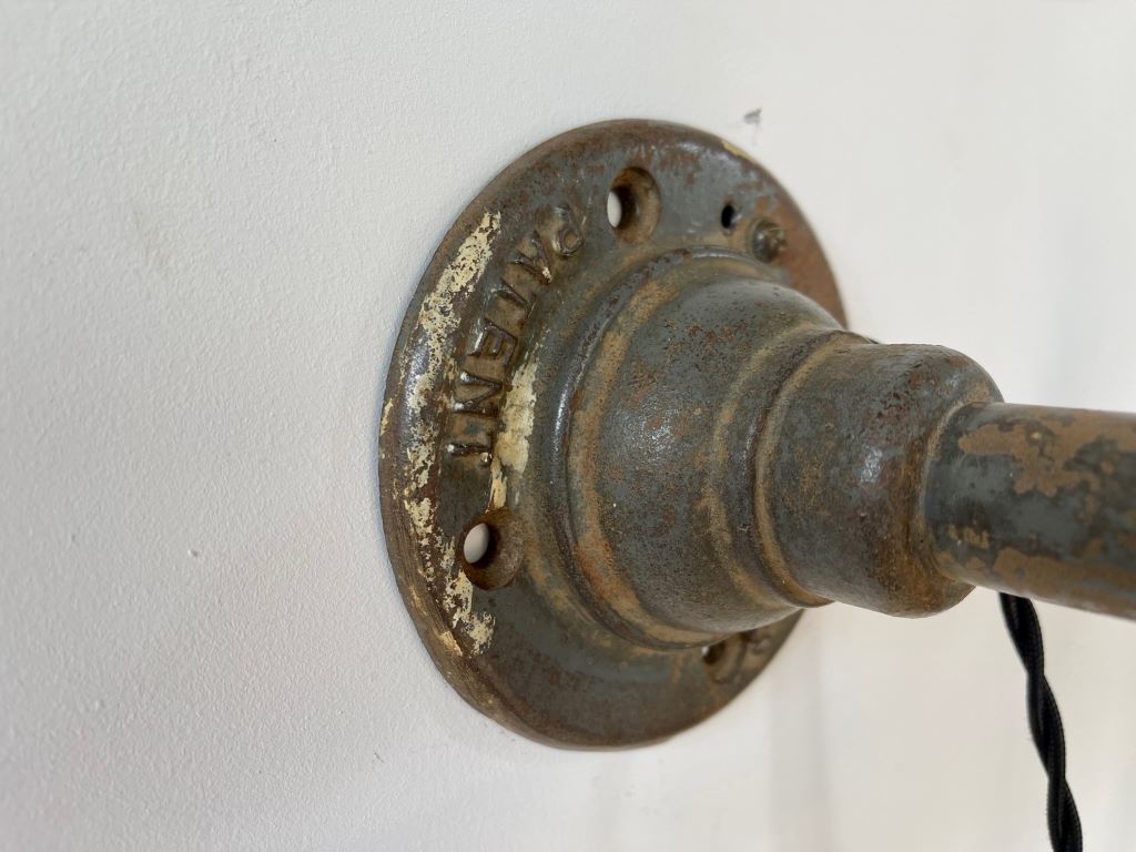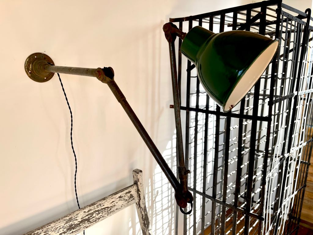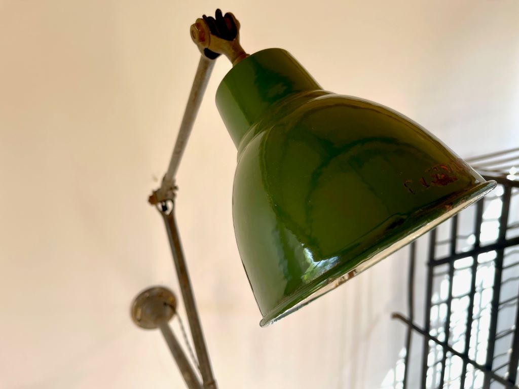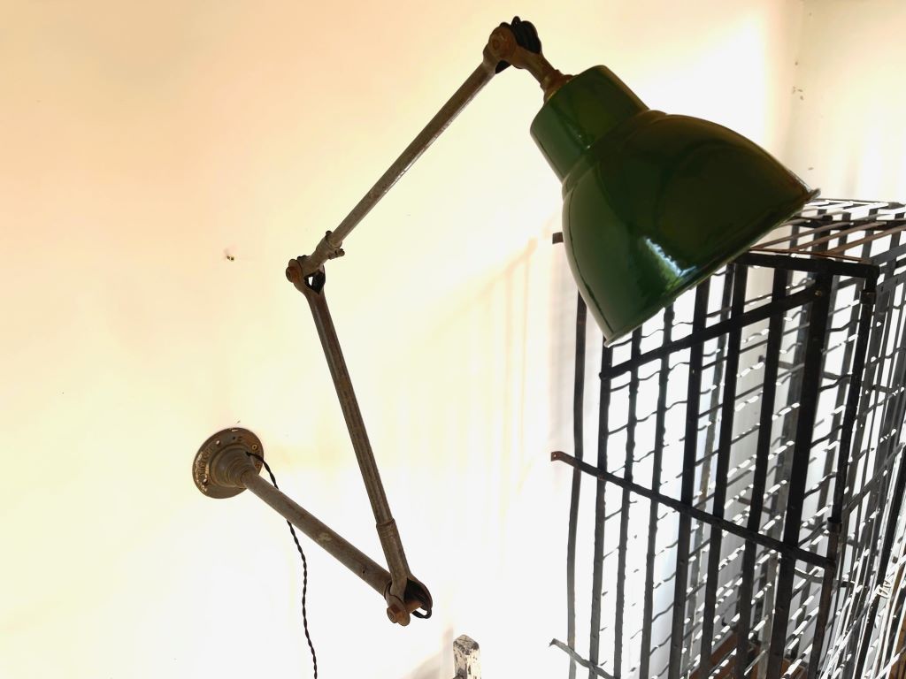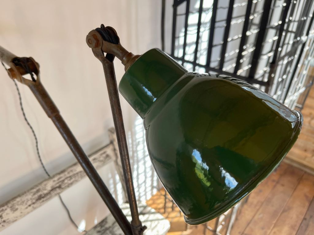 An original 1930’s industrial engineer’s lamp in excellent original condition. Very rare to find these lamps made by Dugdills in such amazing condition. Great colour and patina with a large, three section articulated arm. The lamp has been cleaned and re-wired in a black fabric twisted cord for safety. All sections move to create many options in height, angles, distance form the wall etc. The lamp could be mounted on to a desk or put on to a base to create a large desk/ table lamp. The shade is in perfectly aged and coloured green enamel with the original and very clean white enamel inside. The arm has superb patina and the base has the all important Dugdills stamp for authenticity.