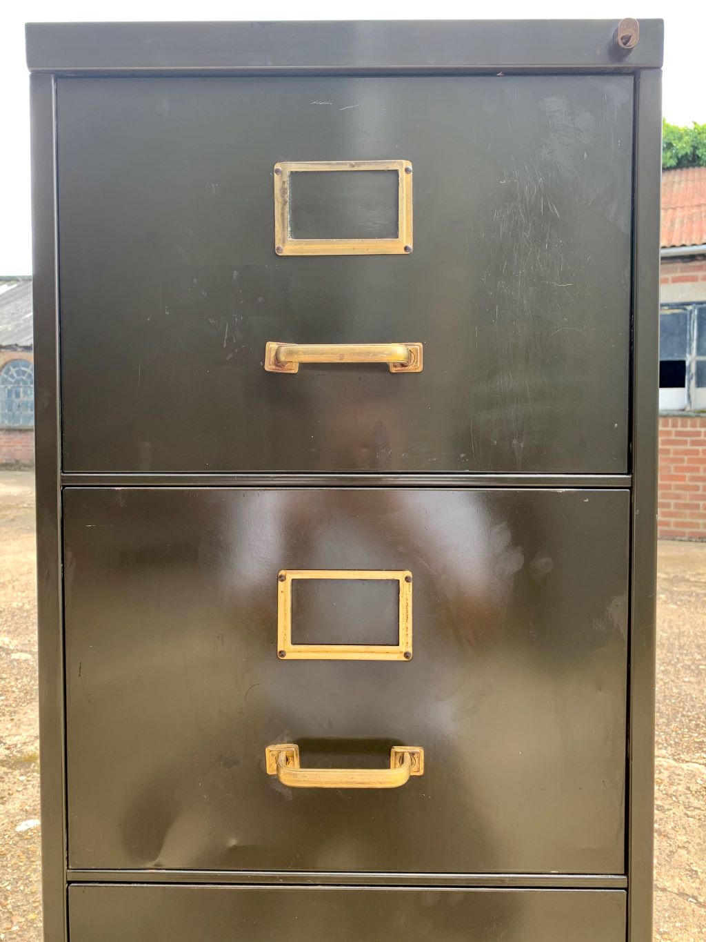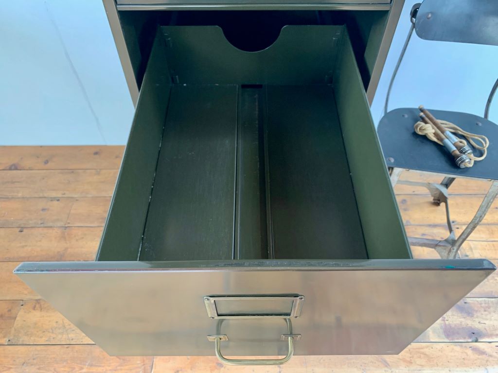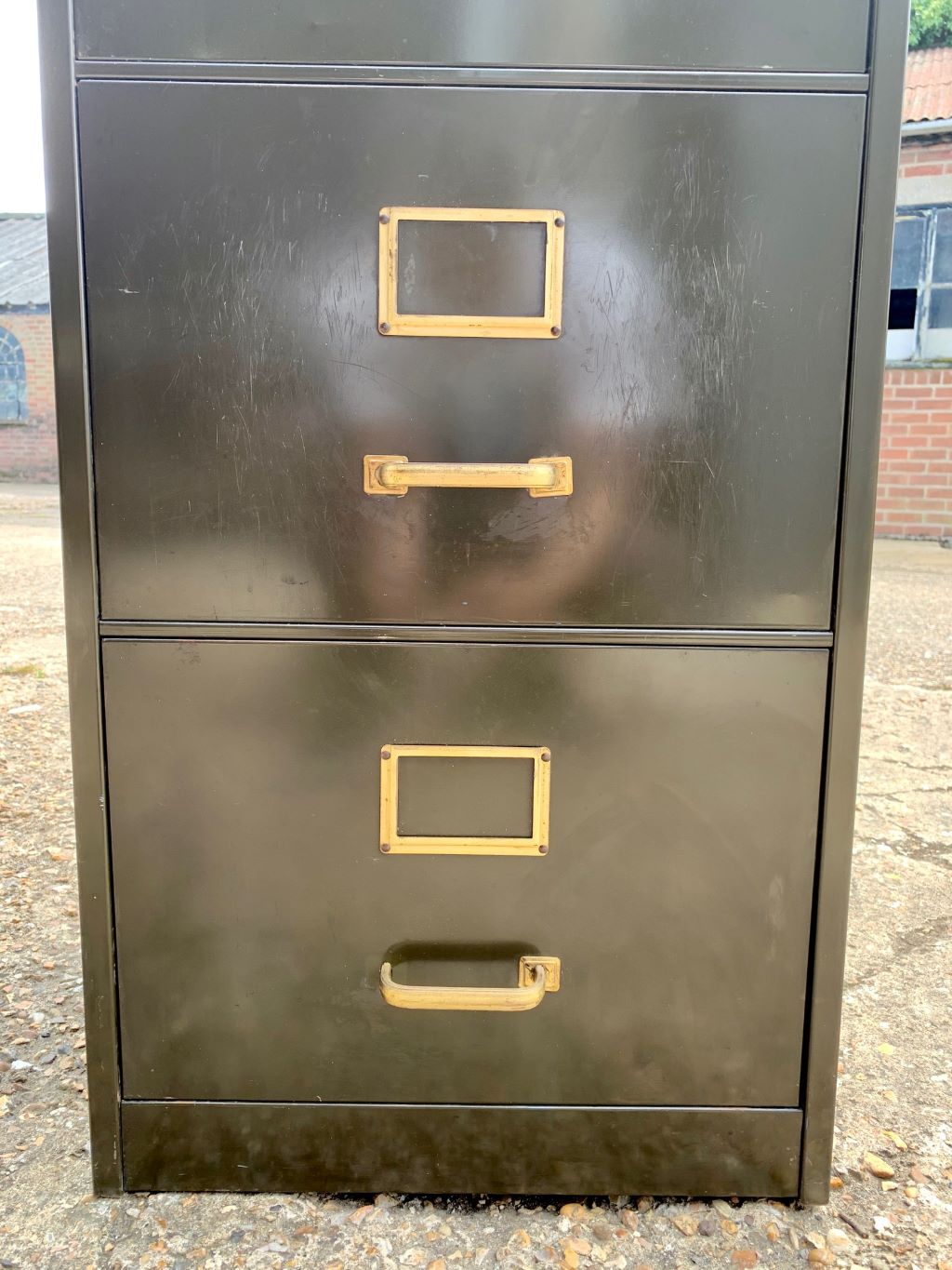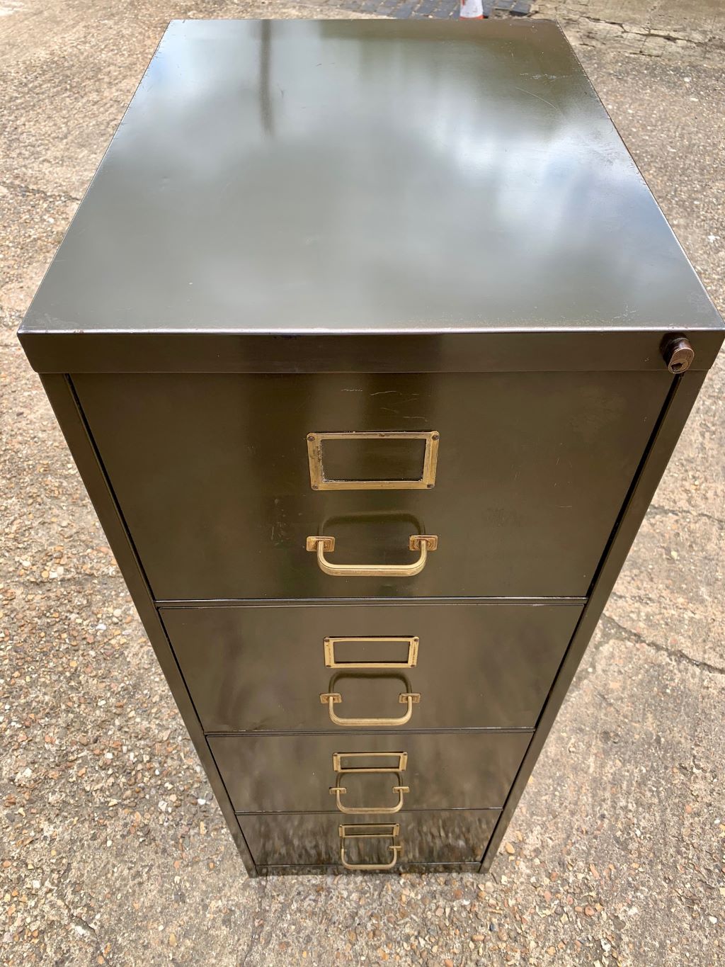 An exceptionally clean and original set of mid century steel filing drawers by Shannon. Most of these mid Century cabinets are by Roneo, Art Metal, Milner etc. This one is very unusual, in that it is produced by Shannon. They are much more well known for their early 20th Century mahogany filing cabinets that regularly fetch prices well over £1000. This steel cabinet is in exactly the right colour, super condition and with the perfectly aged brass ware. A very nice size for home or office. The cabinet and drawers have all been fully cleaned and the runners re-oiled. The cabinet has been cleaned and waxed with carnuba wax for protection and shine. Superb condition. Industrial style and practicality all rolled in to one. A nice piece to be very useful but also to treasure.