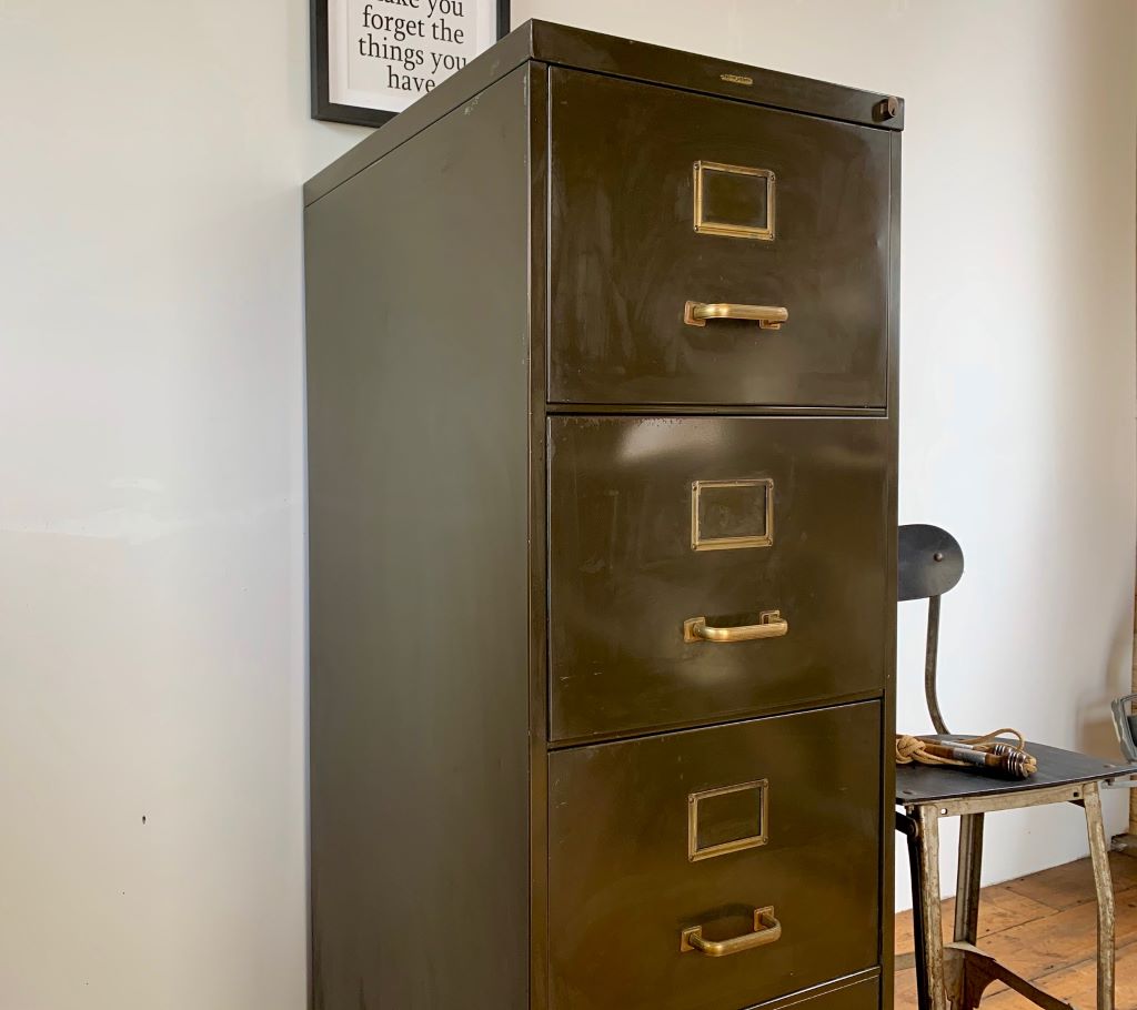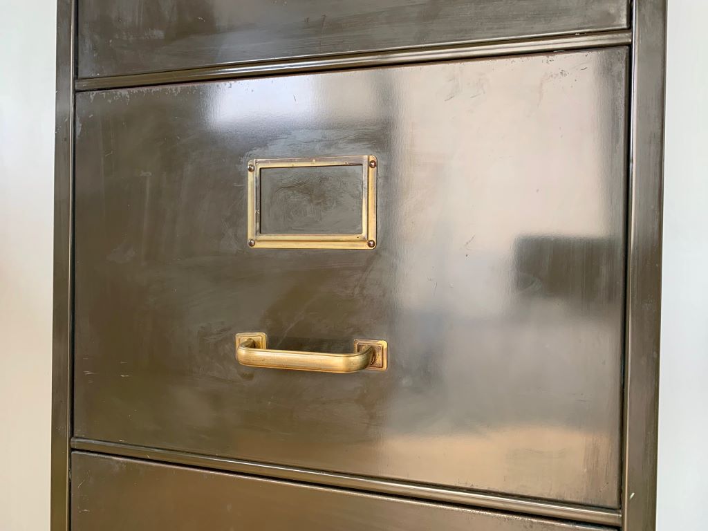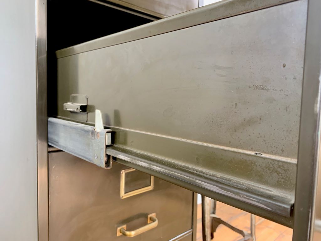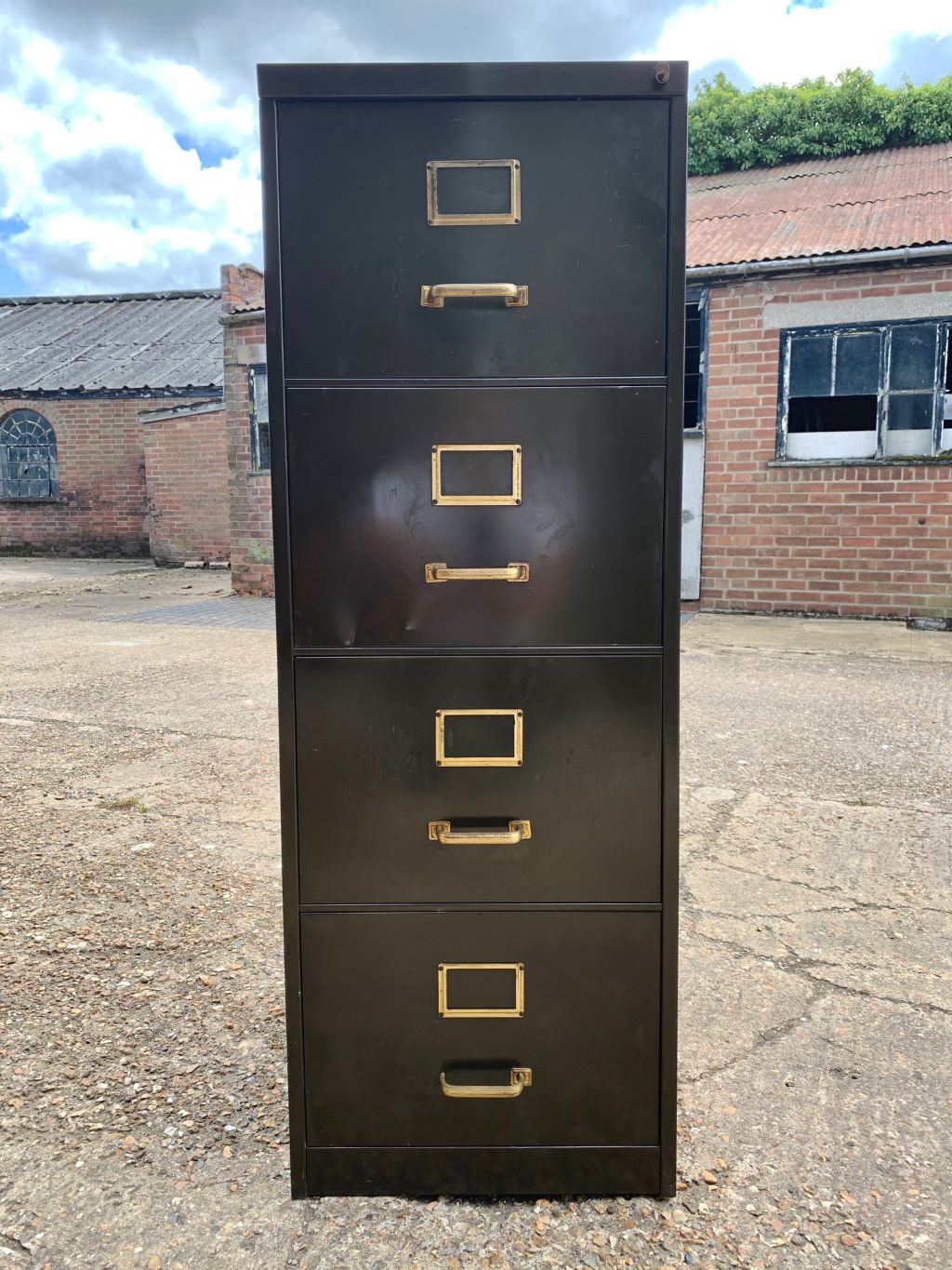 An exceptionally clean and original set of mid century steel filing drawers by Shannon. Most of these mid Century cabinets are by Roneo, Art Metal, Milner etc. This one is very unusual, in that it is produced by Shannon. They are much more well known for their early 20th Century mahogany filing cabinets that regularly fetch prices well over £1000. This steel cabinet is in exactly the right colour, super condition and with the perfectly aged brass ware. A very nice size for home or office. The cabinet and drawers have all been fully cleaned and the runners re-oiled. The cabinet has been cleaned and waxed with carnuba wax for protection and shine. Superb condition. Industrial style and practicality all rolled in to one. A nice piece to be very useful but also to treasure.