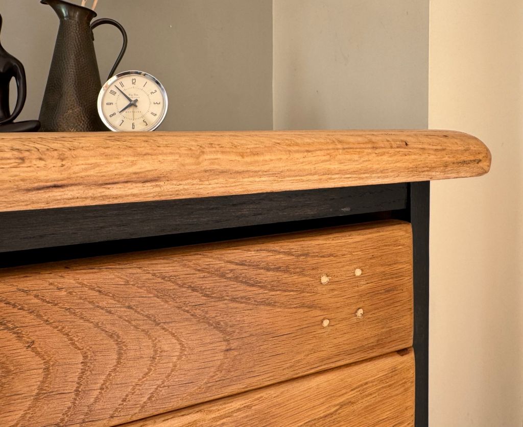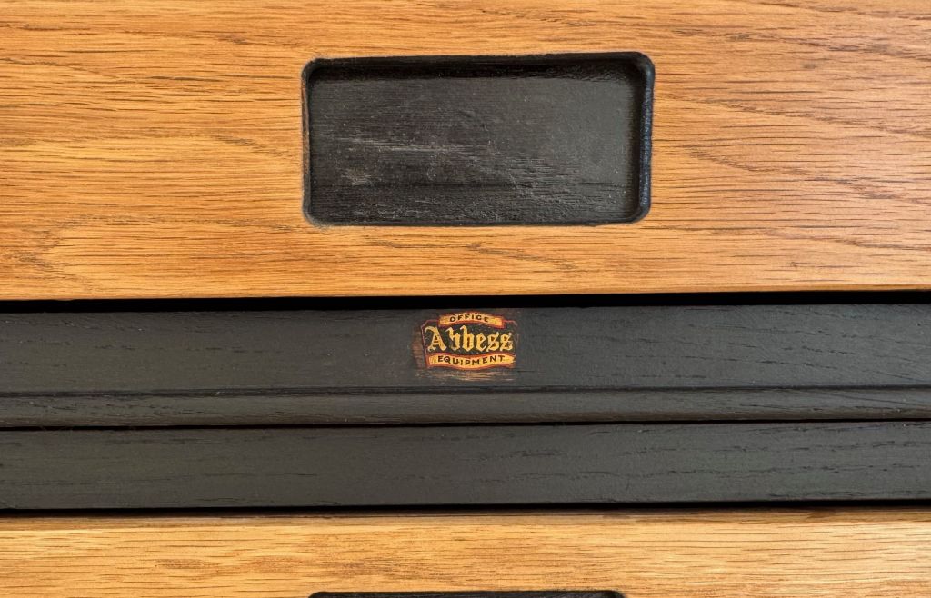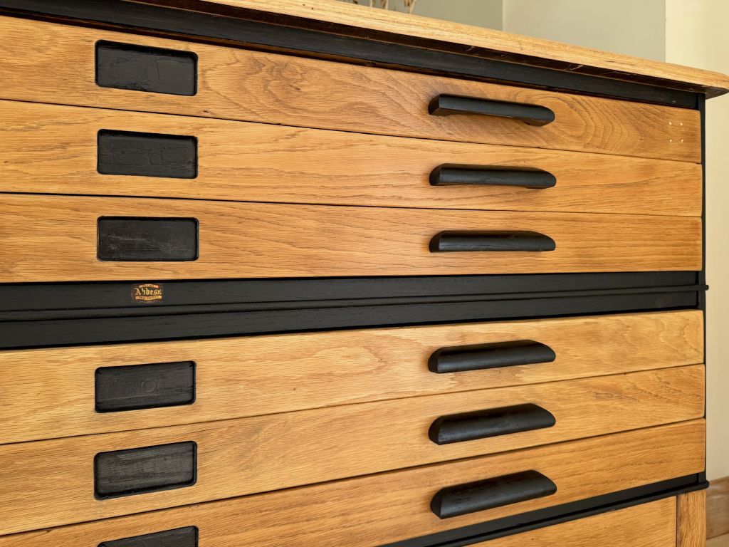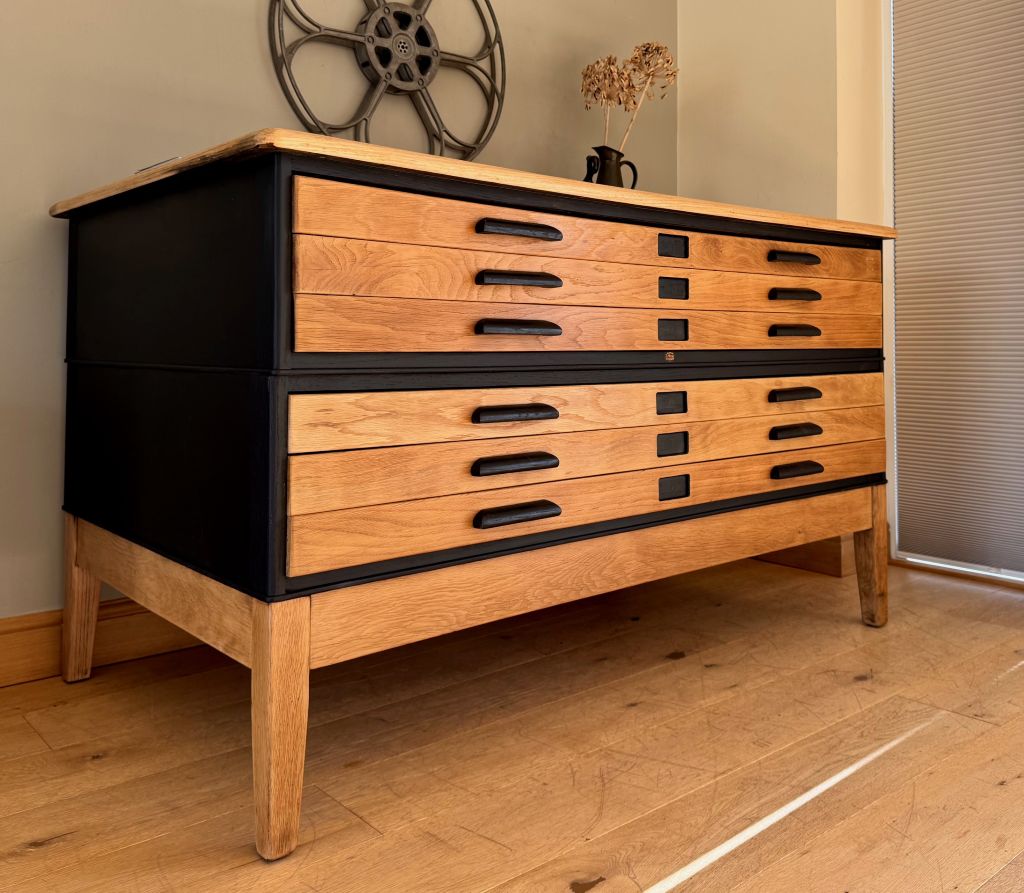 An exceptional 6 drawer Architect/ Plan chest of drawers on original legs, by Abbess. These drawers came to us in a tired old brown stain, peeling away. They are completely original and pretty rare to have their original legs and base still present. We fully stripped away the old brown varnish, sanded the whole carcass, frame, drawers and handles. Then we refinished the piece in a matt black paint for the carcass and original handles with a clear satin finish varnish to the gorgeous oak finish.