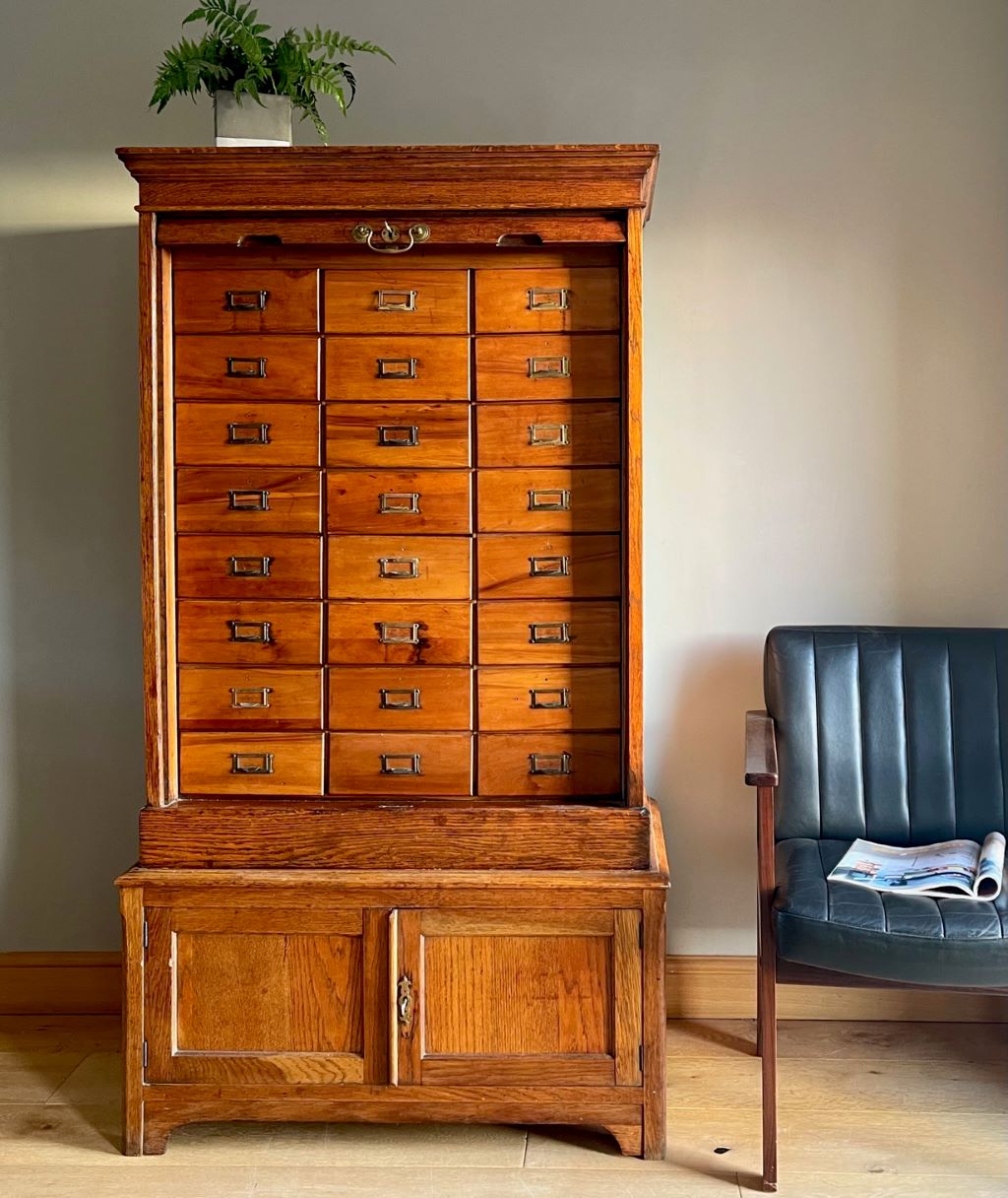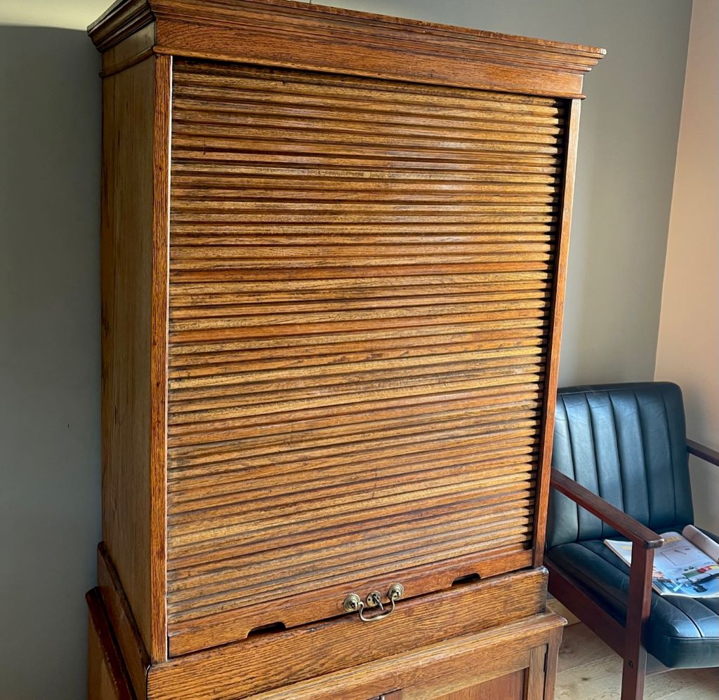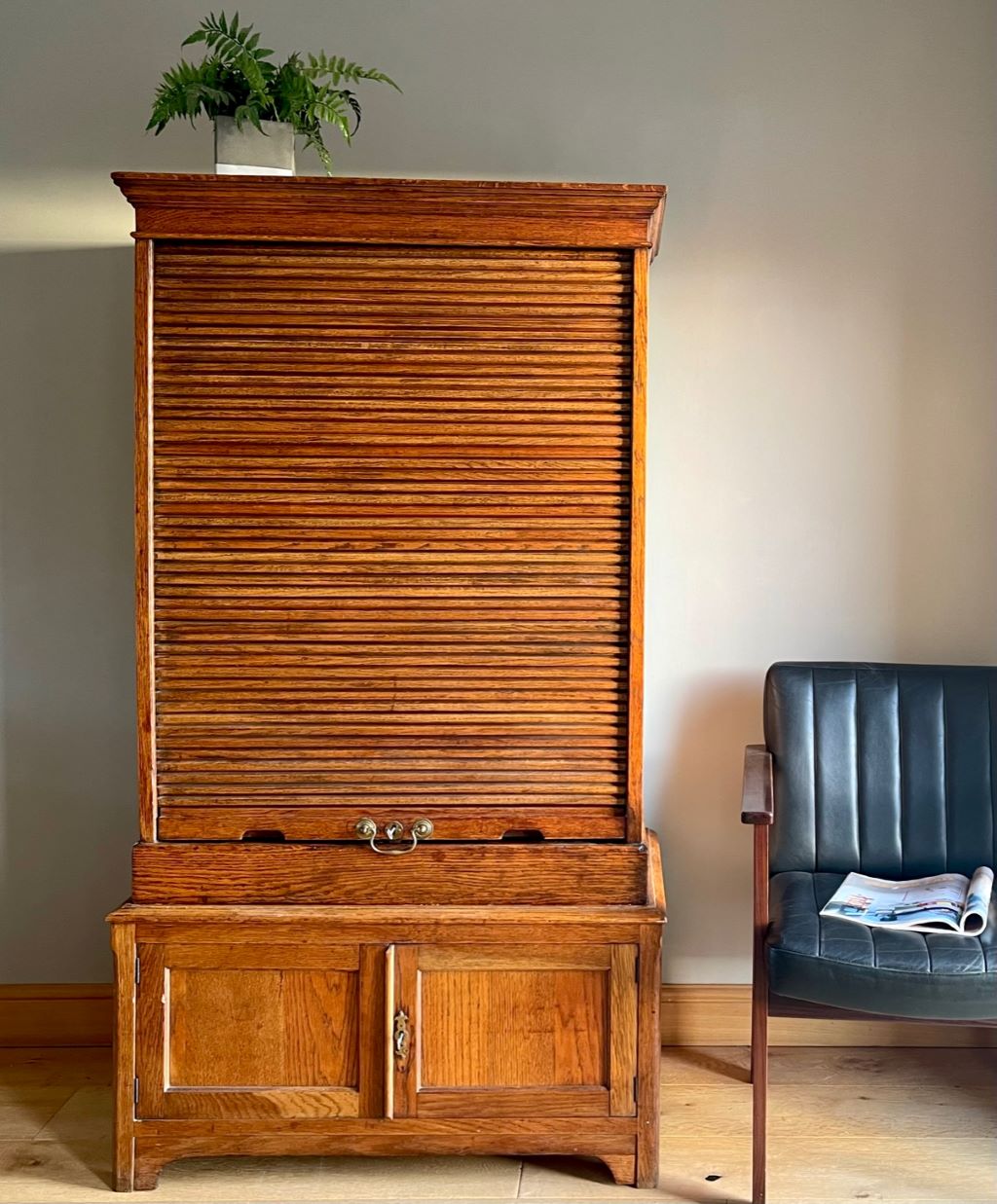 The cabinet comes with all of its original pull out haberdashery type drawers and brass label holders, which are just gorgeous. The right hand side of each drawer is scooped, as these cupboards originally held paperwork/ filing in each drawer. All of the drawers run freely. There is also a very useful lockable cupboard to the lower section. The tambour door runs easily and also has its original lock and key. We adore everything about this piece – the size, the design work, the colour, and its history.