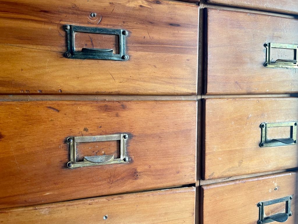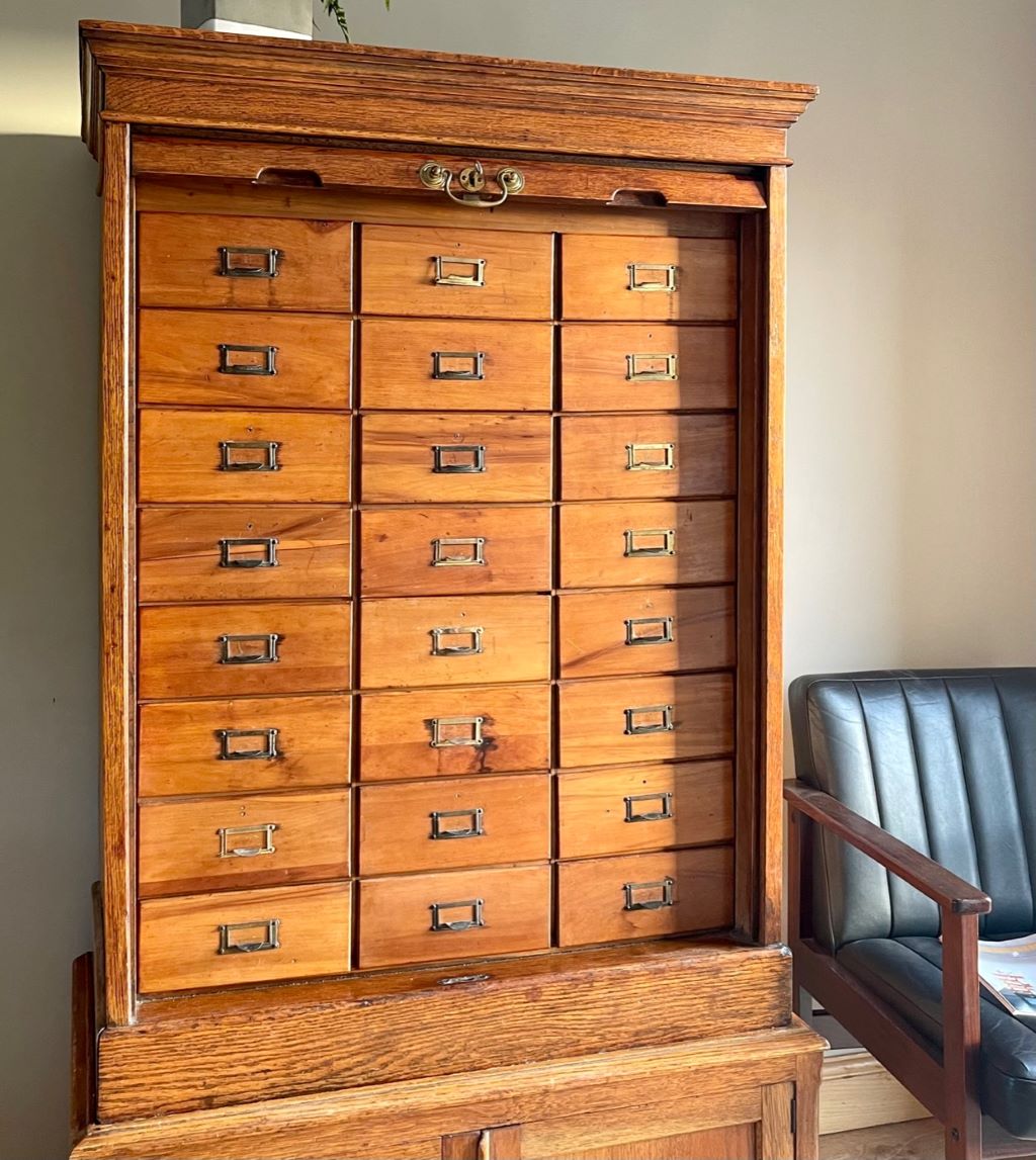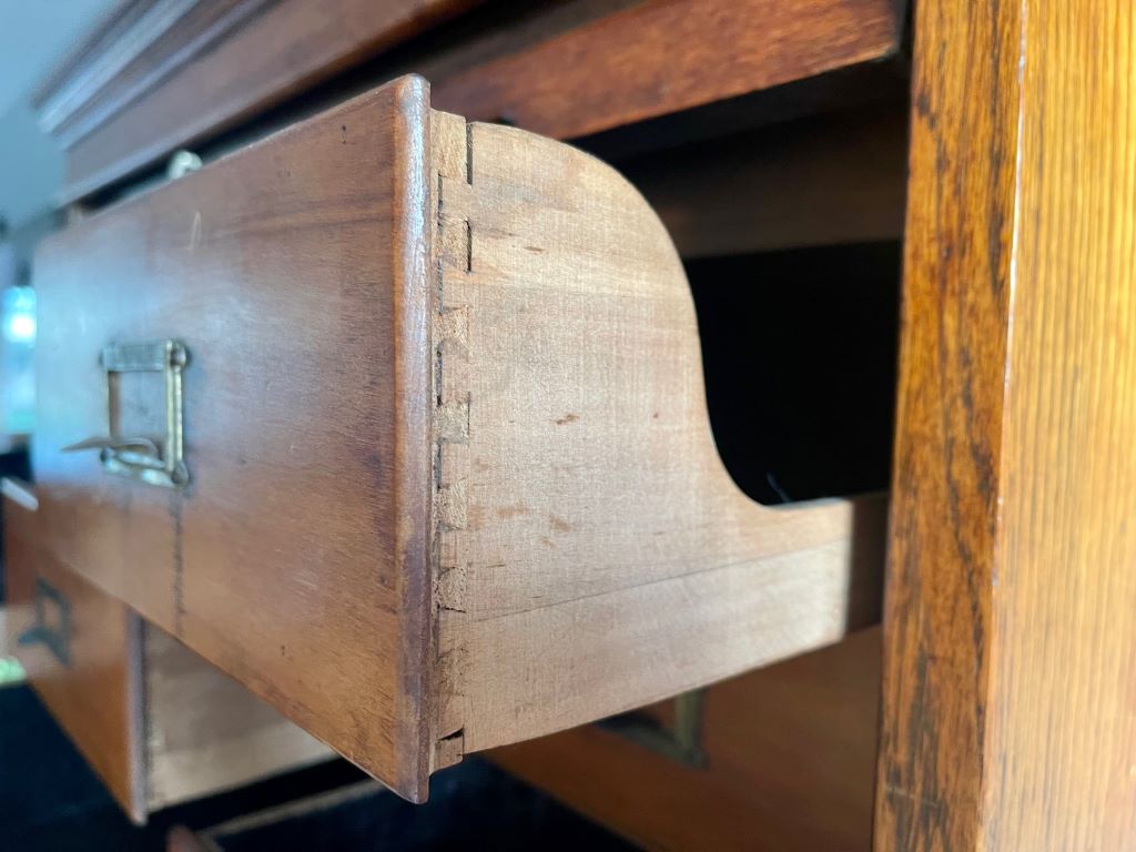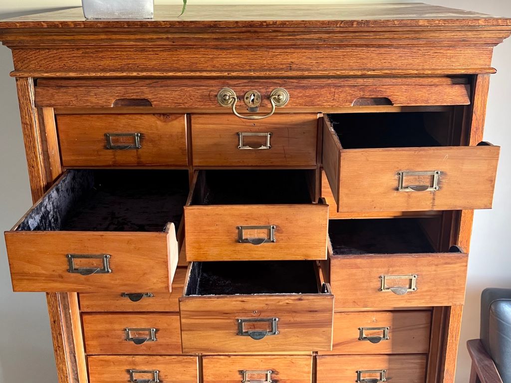 The cabinet comes with all of its original pull out haberdashery type drawers and brass label holders, which are just gorgeous. The right hand side of each drawer is scooped, as these cupboards originally held paperwork/ filing in each drawer. All of the drawers run freely. There is also a very useful lockable cupboard to the lower section. The tambour door runs easily and also has its original lock and key. We adore everything about this piece – the size, the design work, the colour, and its history.
