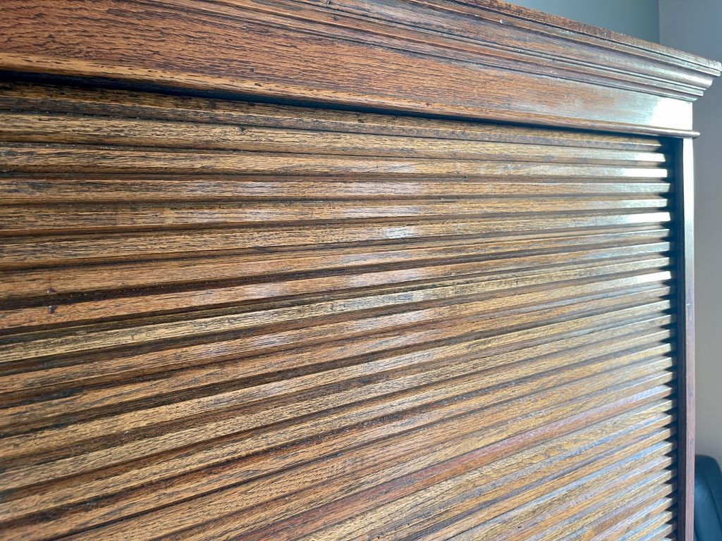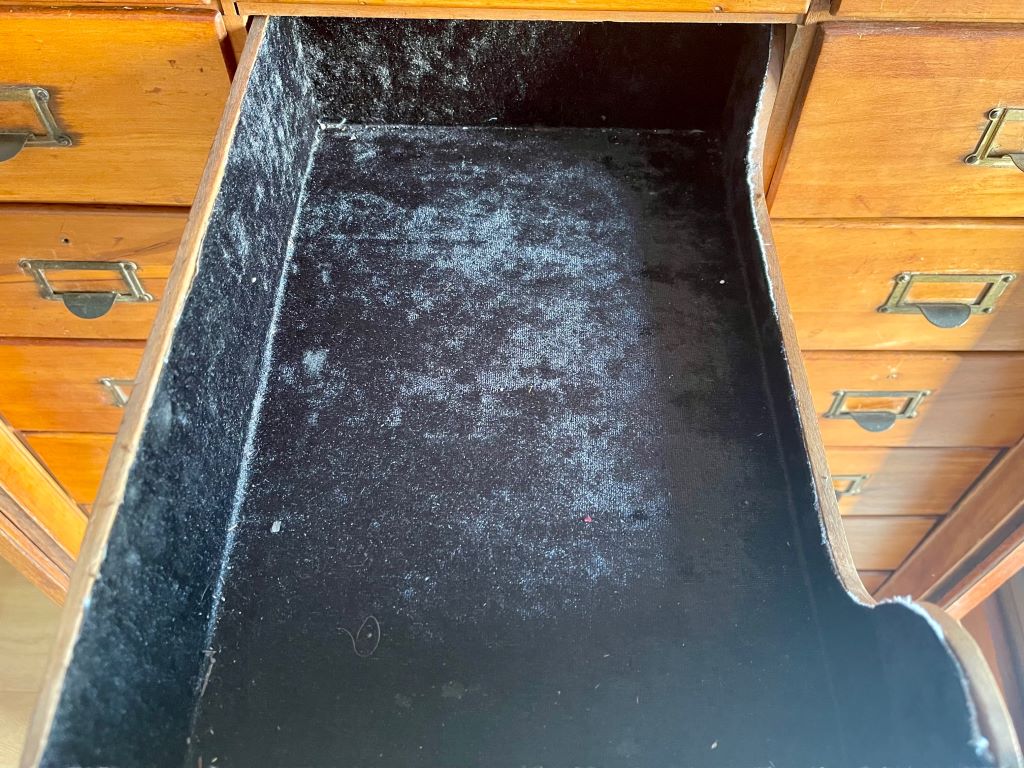 A truly stunning and beautifully coloured tambour cabinet in Oak, dating from the 1930’s. It came to us from an avid film collector in Hertfordshire. He used it to store slides; and hence why the drawers are lined with a crushed velvet type material. He sold this piece to us as he needed a bigger cabinet for his ever expanding collection!