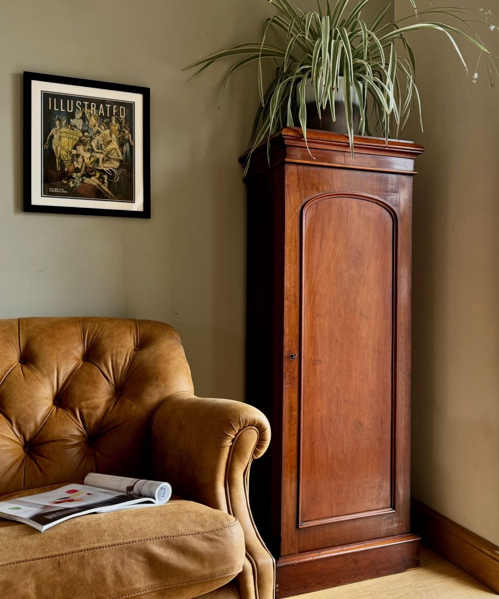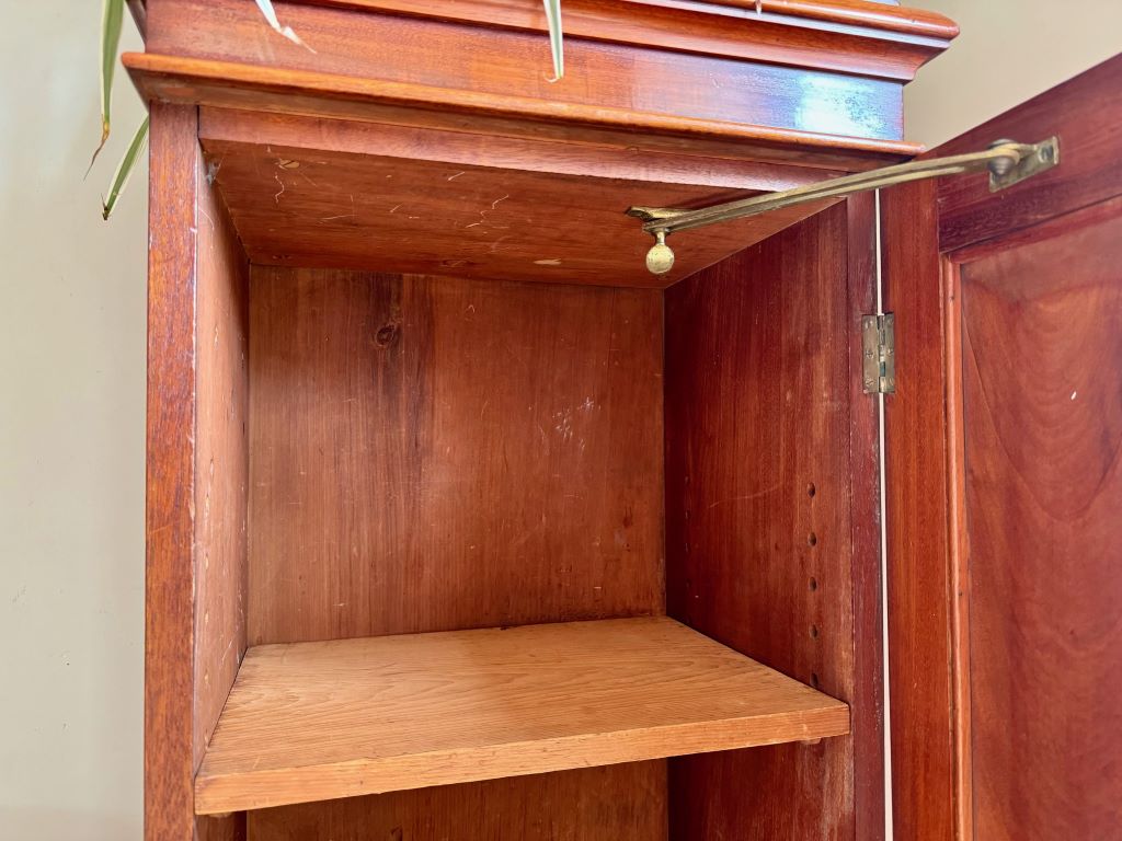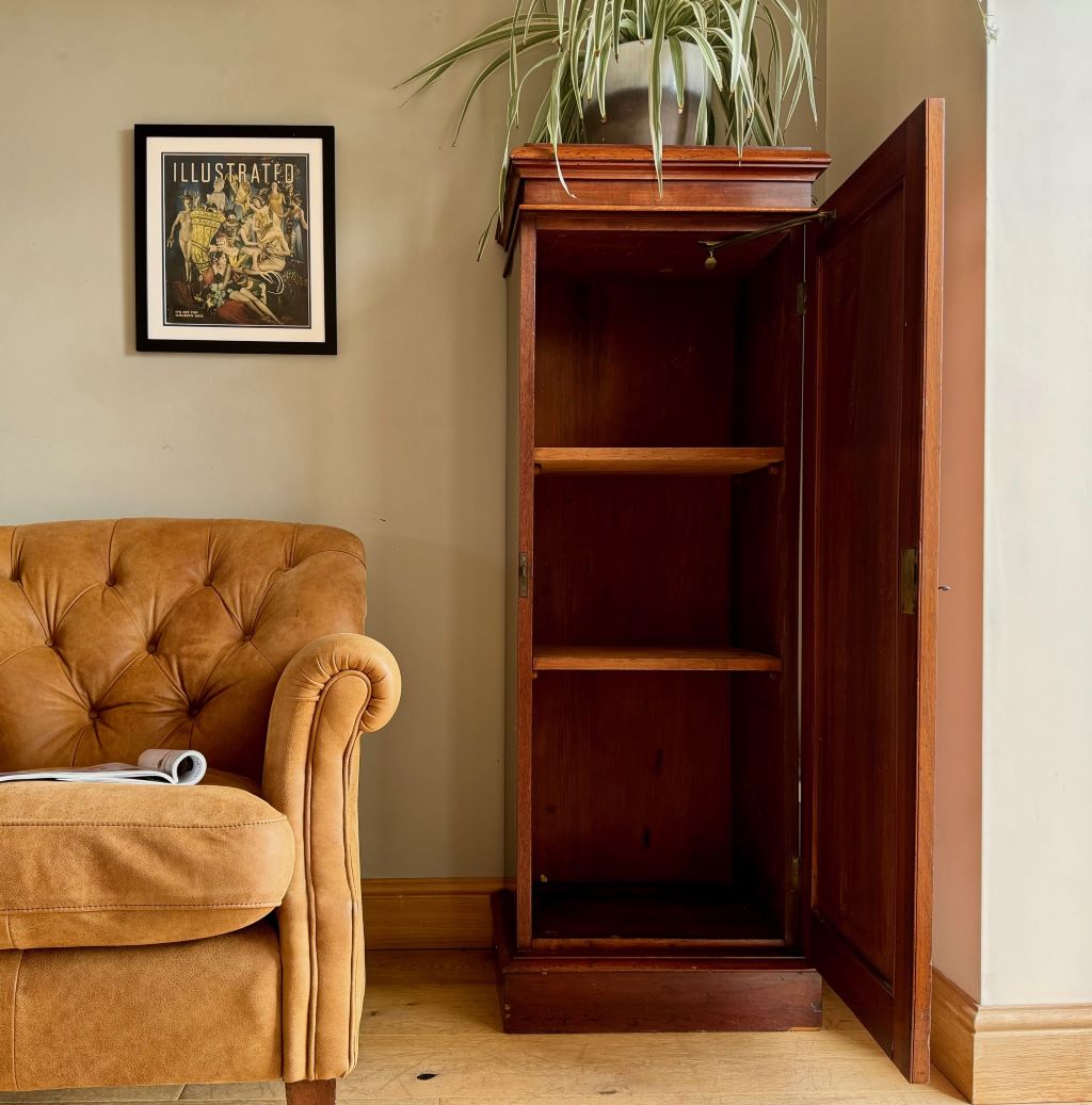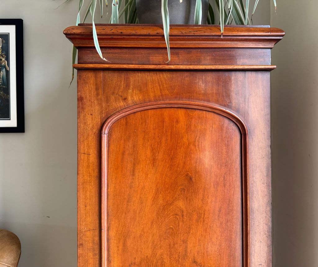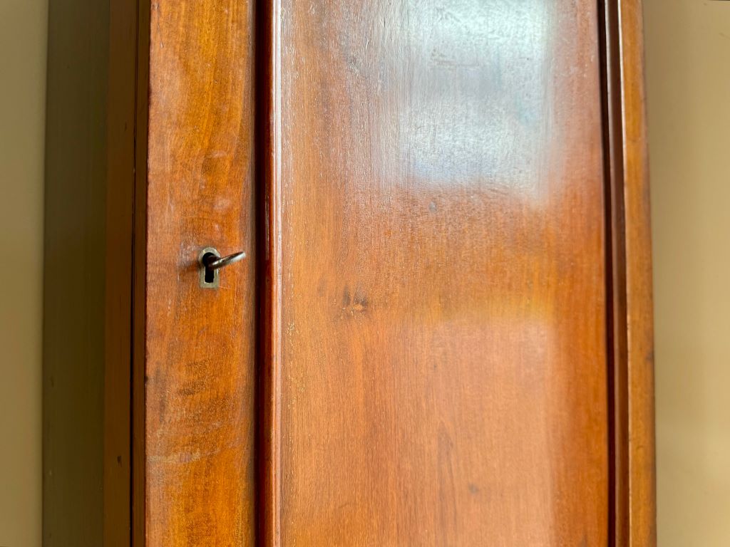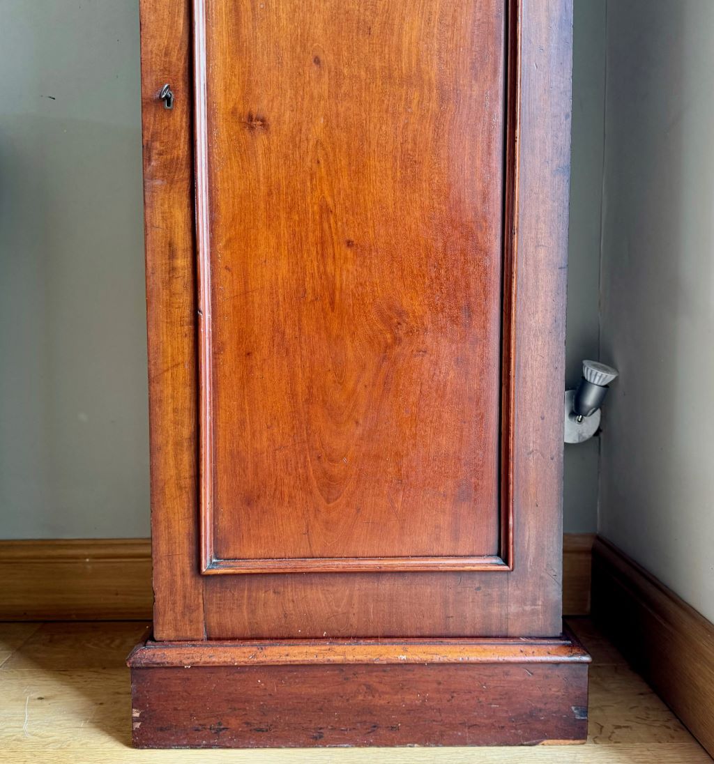 A original turn of the Century cupboard in beautifully aged and coloured mahogany. The cupboard dates to around 1890-1910 and is unusual in it’s height and width. We think the cupboard has so many uses as a shoe cupboard, toiletries, a bathroom cabinet etc. The piece retains all of its original brass ware, working lock and one key.
