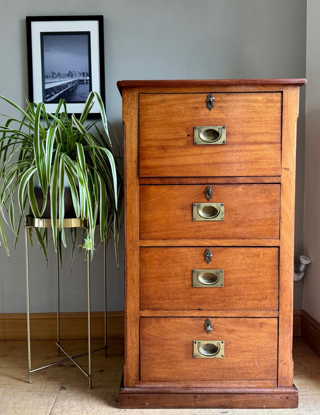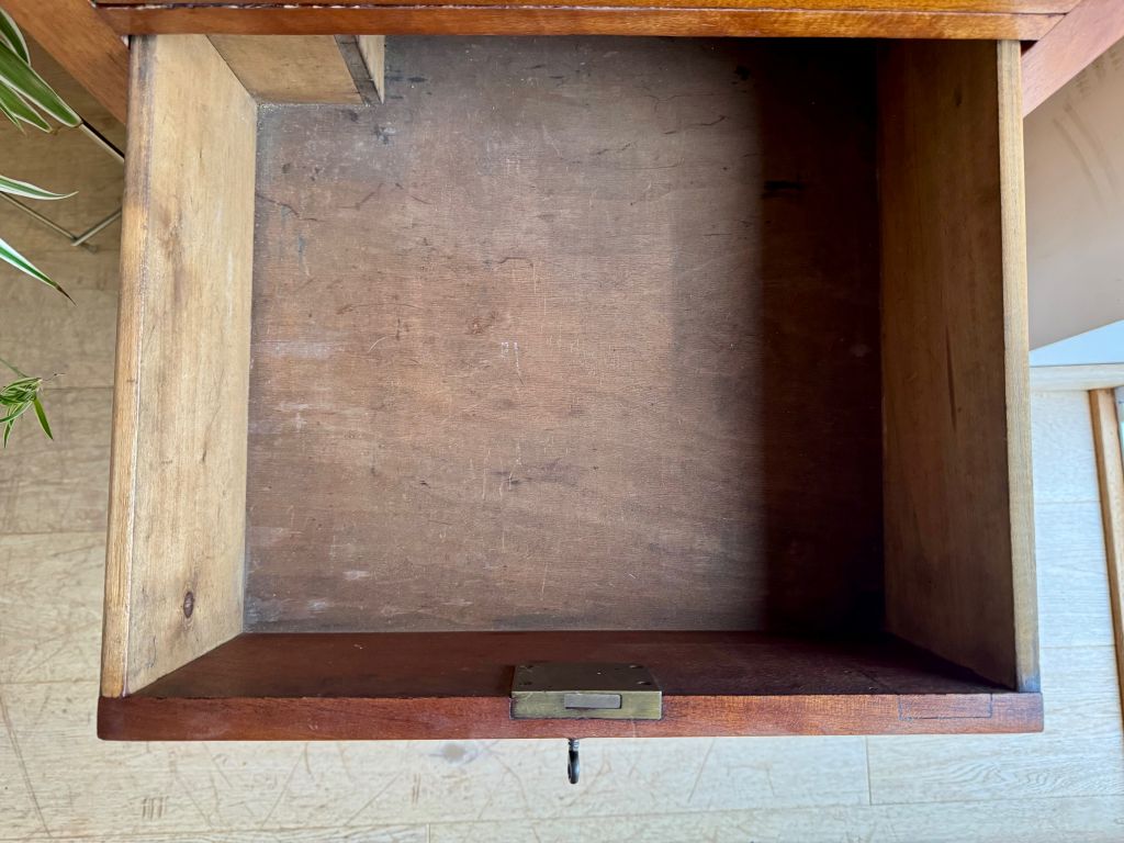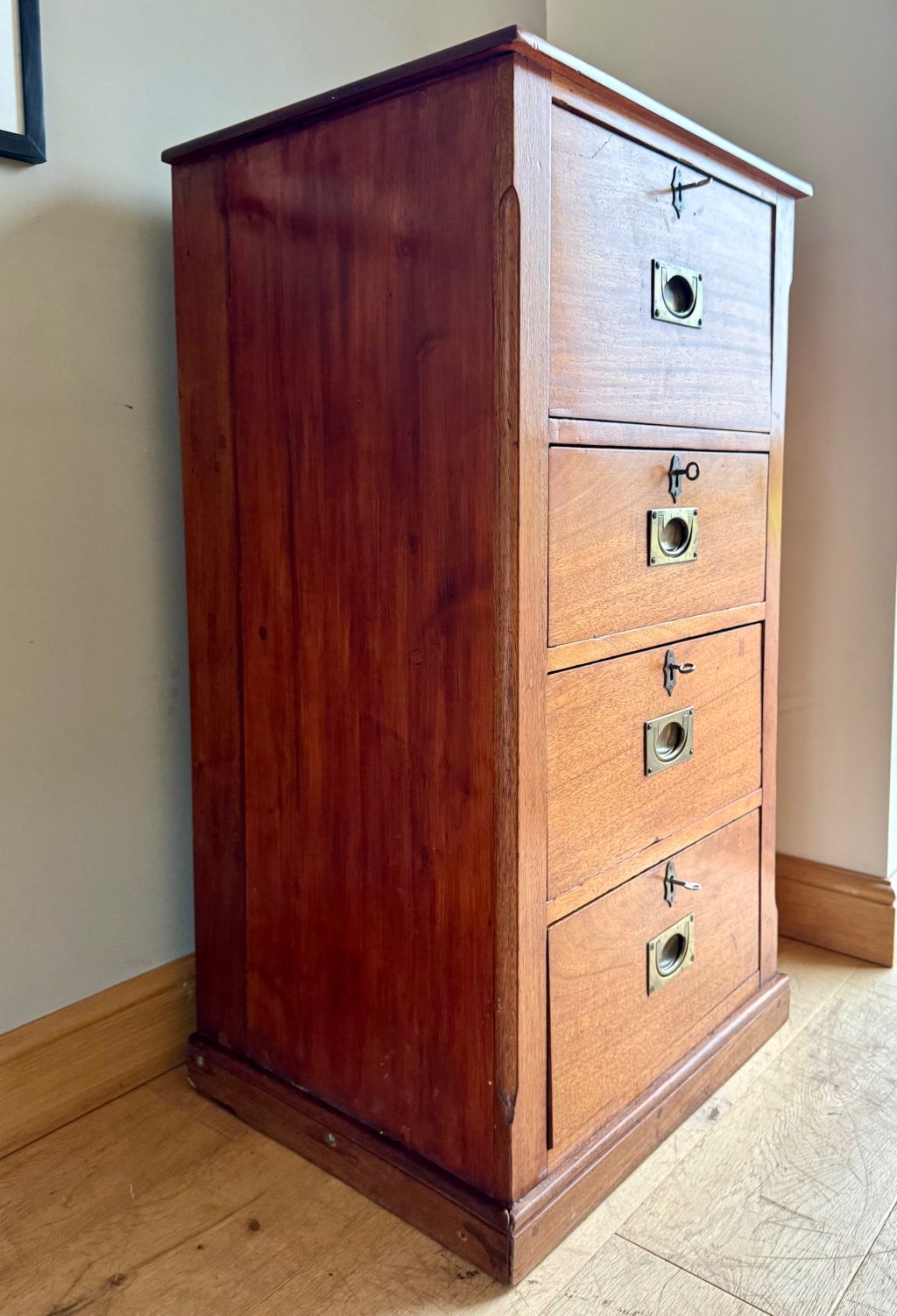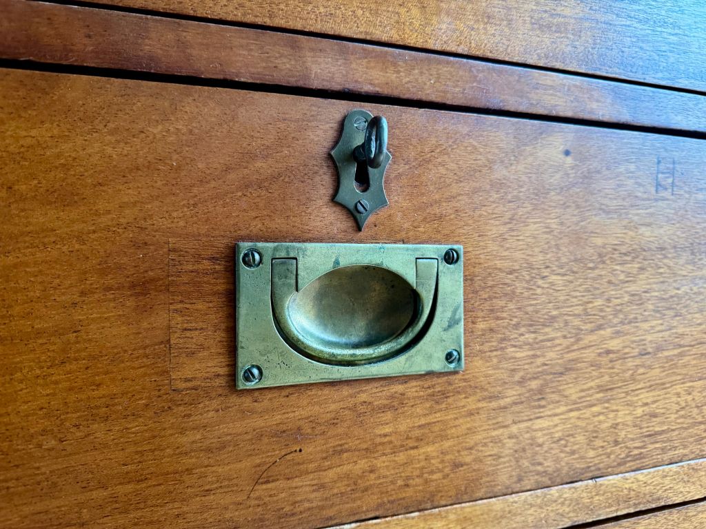 We just love the age, colour and style of these gorgeous Campaign drawers. They are made from mahogany which has coloured perfectly over the years of use.  They date to around the turn of the 19th/20th Century and is a beautifully styled piece. The top drawer has a pull down front, used to create a secretaire type desk. It also has storage sections for letters and stationery. The lower three drawers are of a standard configuration, offering lovely deep storage. All four brass handles and escutcheons have aged perfectly. Each drawer has a working lock and key – which is very rare to find. There is even a hidden rear section made to hold rolled up maps or drawings. All in all, a stunning stylish antique offering timeless appeal.
