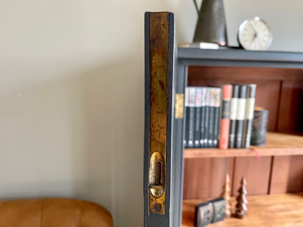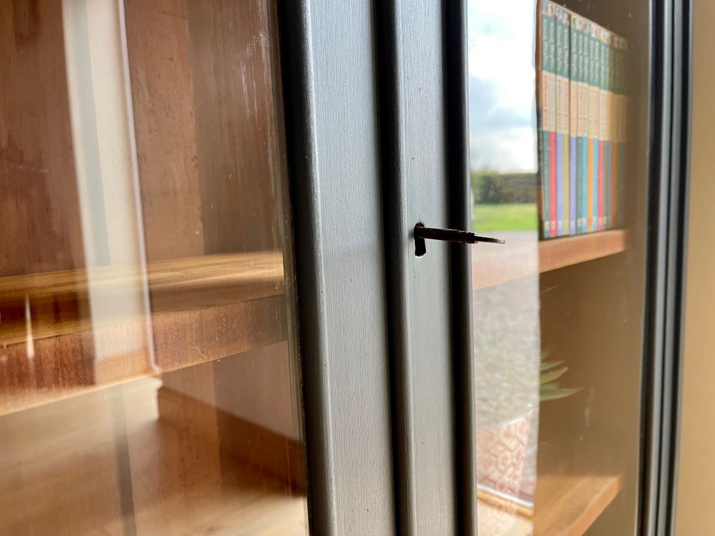 A simply stunning mid to late 19th Century Victorian glazed bookcase with original glass, internal sliding bolts, lock and key and brass handles. It dates from around 1860 to 1880. We fully stripped the piece and refinished it in original Farrow & Ball paint – Railings to the exterior with a clear wax for finish and protection. We also stripped back the interior to its gorgeous natural wood finish and then applied a Matt varnish finish for protection too. The shelves are easily adjustable or completely removable with the side support system allowing increments of approximately 2.5cm for each ‘step’.